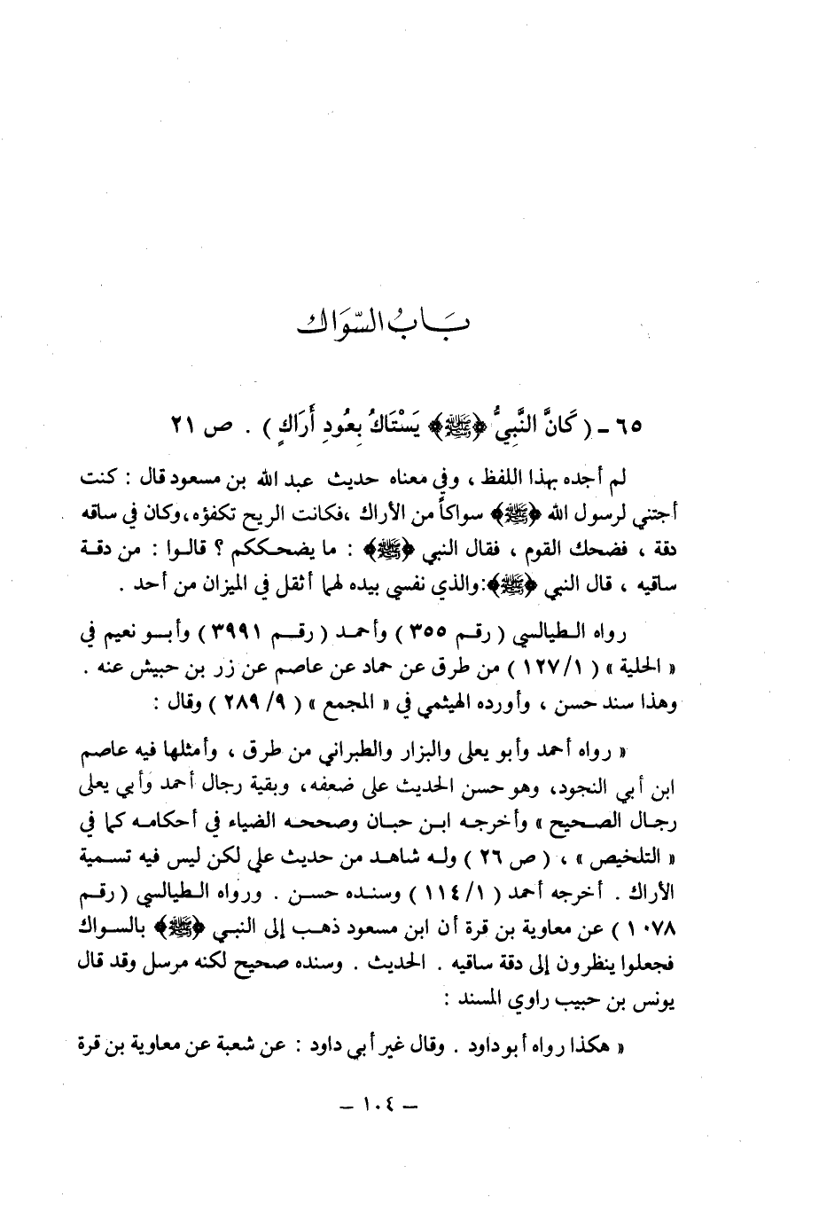 (65) - (" كان النبى صلى الله عليه وسلم يستاك بعود أراك " (ص 21) .