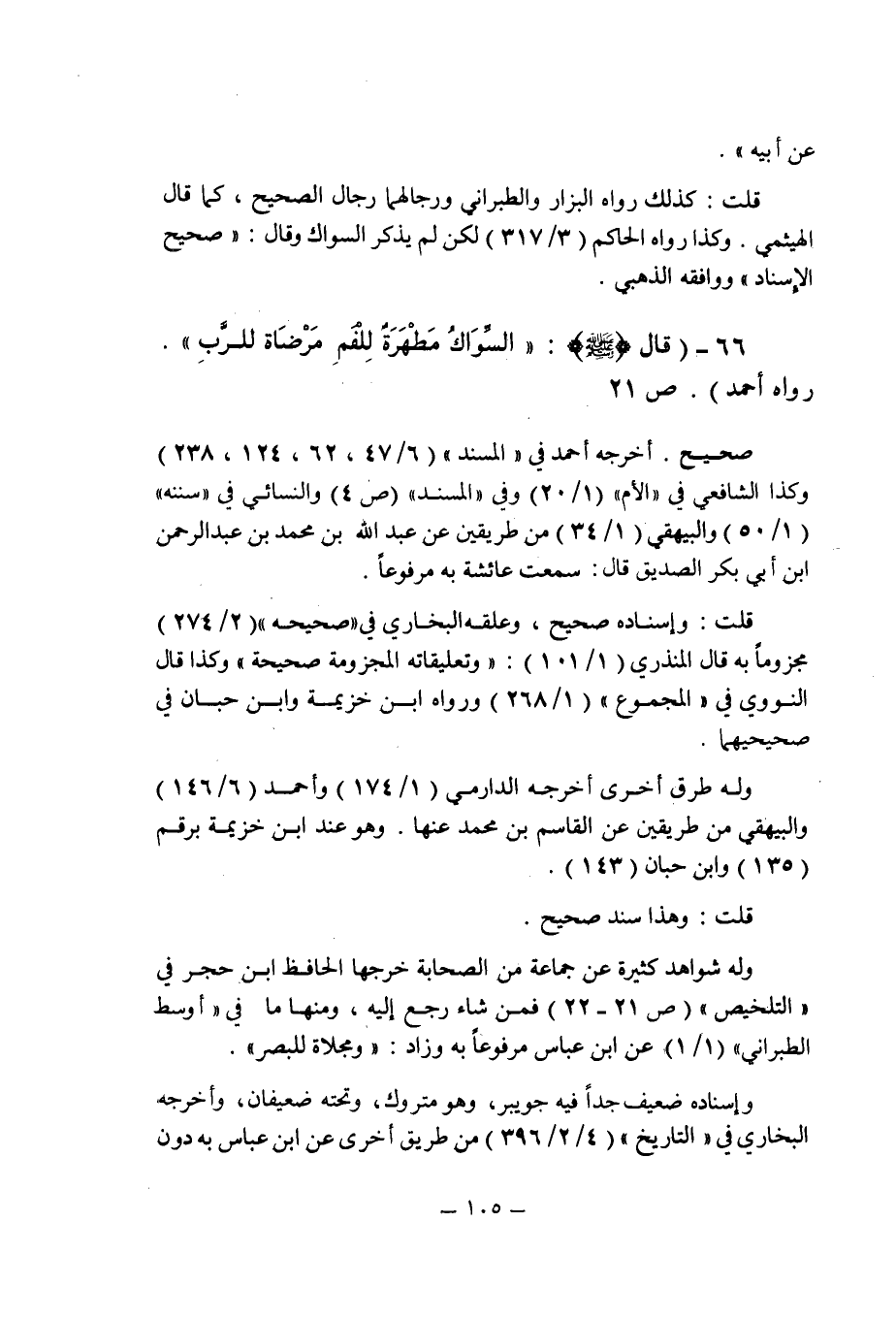 (66) - (قال صلى الله عليه وسلم: " السواك مطهرة للفم مرضاة للرب ". رواه أحمد (ص 21) .