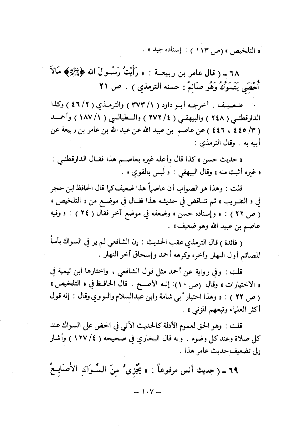 (68) - (قال عامر بن ربيعة: " رأيت رسول الله صلى الله عليه وسلم مالا أحصى يتسوك وهو صائم ". حسنه الترمذى (ص 21) .