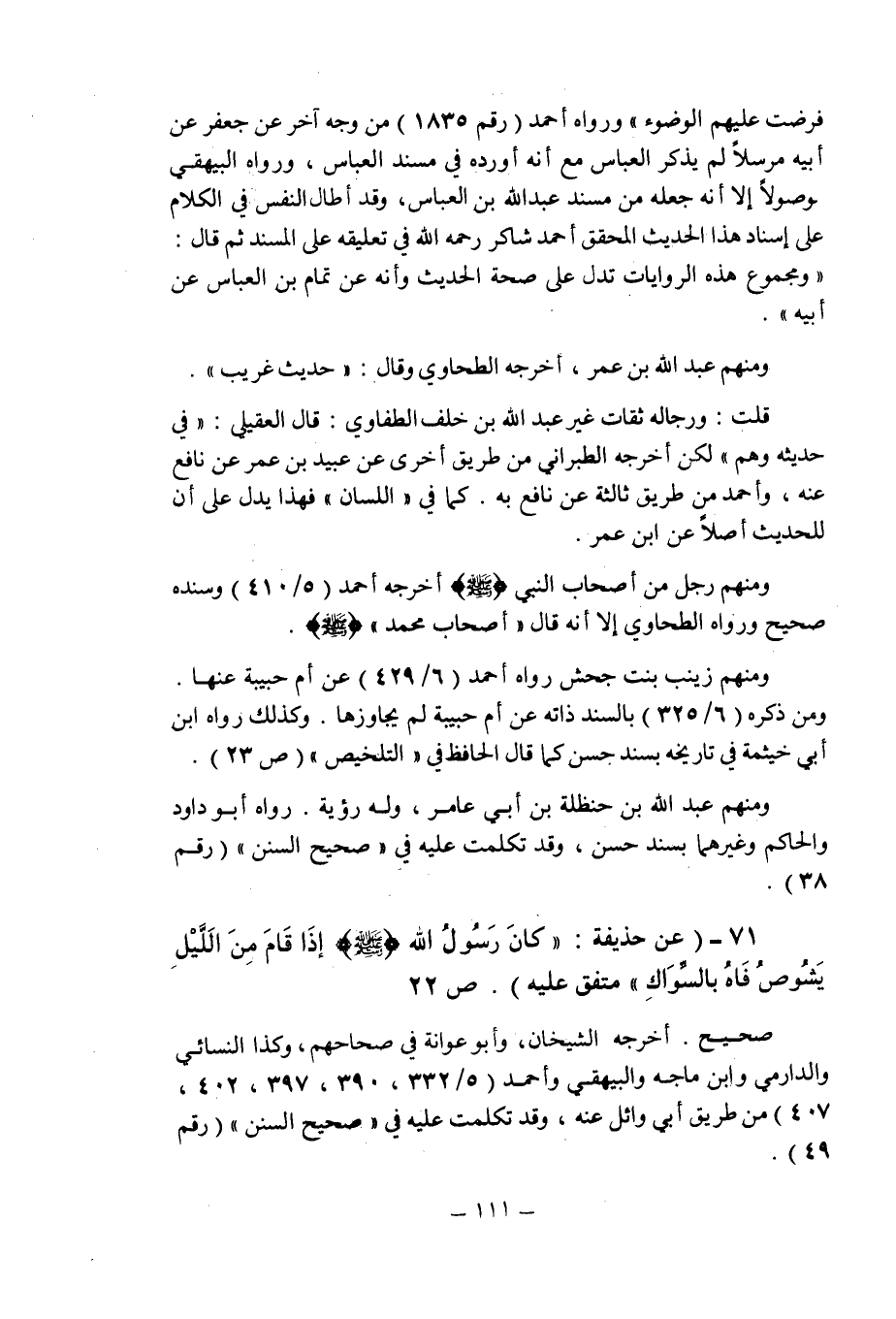 (71) - (عن حذيفة: " كان رسول الله صلى الله عليه وسلم إذا قام من الليل يشوص فاه بالسواك ". متفق عليه (ص 22) .