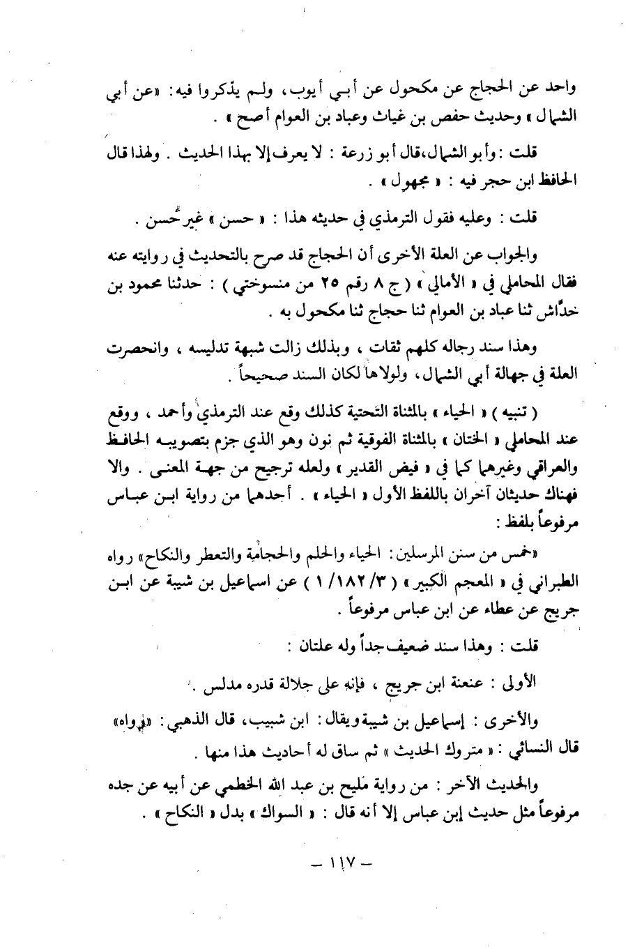 (تنبيه) " الحياء " بالمثناة التحتية كذلك وقع عند الترمذى وأحمد , ووقع عند المحاملى " الختان " بالمثناة الفوقية ثم نون وهو الذى جزم بتصويبه الحافظ والعراقى وغيرهما كما فى " فيض القدير " ولعله ترجيح من جهة المعنى. وإلا فهناك حديثان آخران باللفظ الأول " الحياء ".
