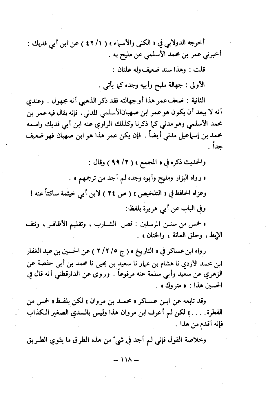 الثانية: ضعف عمر هذا أو جهالته فقد ذكر الذهبى أنه مجهول , وعندى أنه لا يبعد أن يكون هو عمر بن صهبان الأسلمى المدنى , فإنه يقال فيه عمر بن محمد الأسلمى وهو مدنى كما ذكرنا وكذلك الراوى عنه ابن أبى فديك واسمه محمد بن إسماعيل مدنى أيضا , فإن يكن عمر هذا هو ابن صهبان فهو ضعيف جدا.