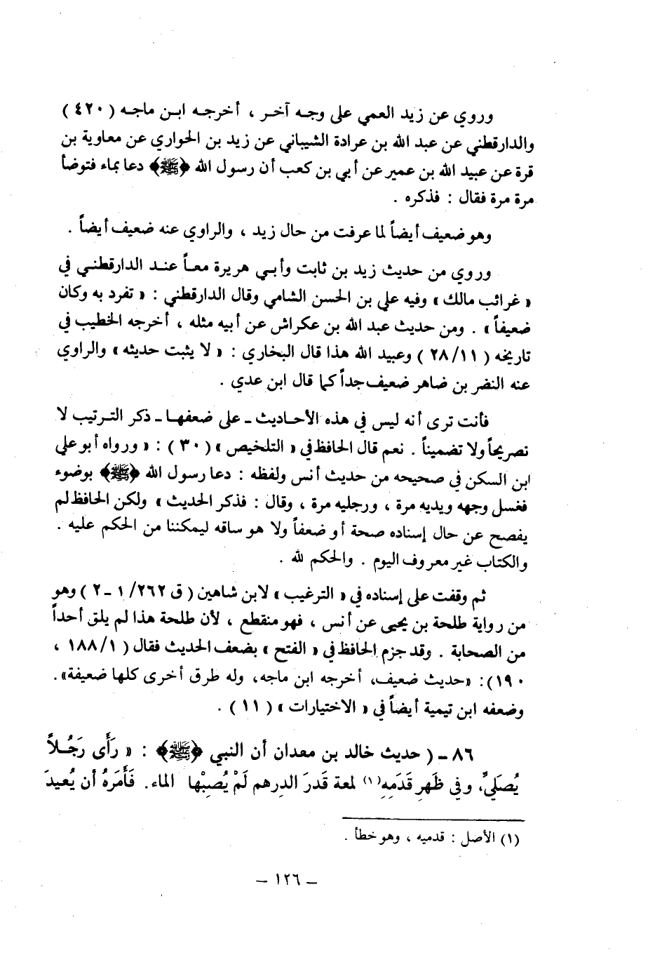 (86) - (حديث خالد بن معدان أن النبى صلى الله عليه وسلم: " رأى رجلا يصلى , وفى ظهر قدمه (1) لمعة قدر الدرهم لم يصبها الماء , فأمره أن يعيد