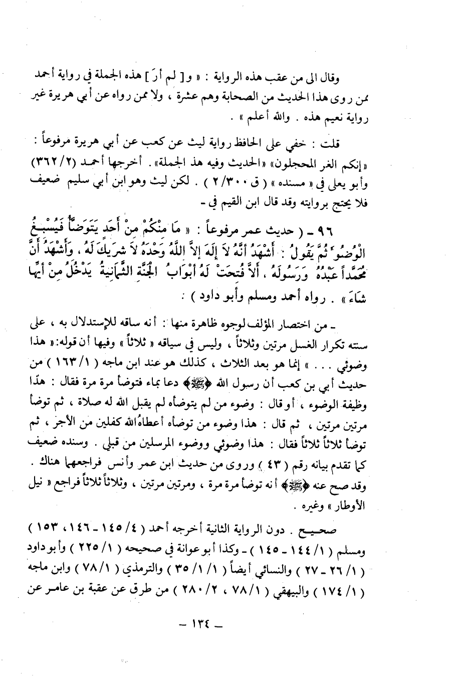(96) - (حديث عمر مرفوعا: " ما منكم من أحد يتوضأ فيسبغ الوضوء ثم يقول: أشهد أنه لا إله إلا الله وحده لا شريك له , وأشهد أن محمدا عبده ورسوله , إلا فتحت له أبواب الجنة الثمانية يدخل من أيها شاء ". رواه أحمد ومسلم وأبو داود (ص 29) .