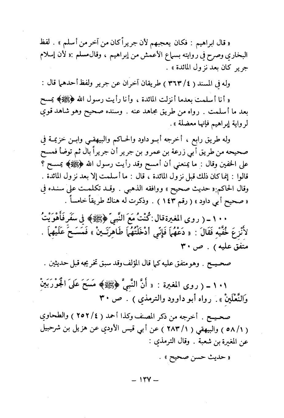 (101) - (روى المغيرة: " أن النبى صلى الله عليه وسلم مسح على الجوربين والنعلين ". رواه أبو داود والترمذى (ص 30) .