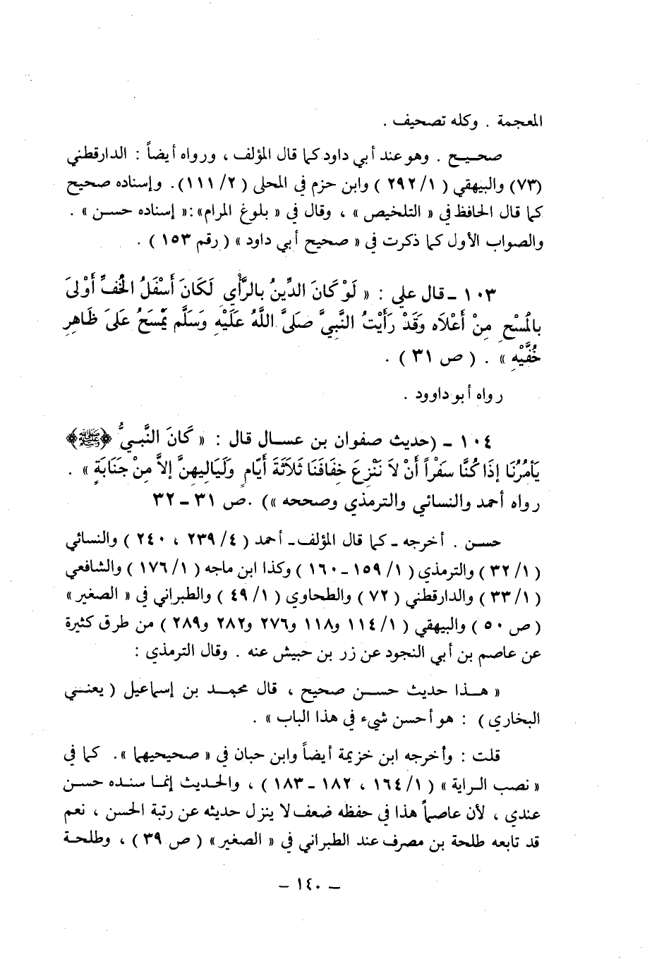 (104) - (حديث صفوان بن عسال قال: " كان النبى صلى الله عليه وسلم يأمرنا إذا كنا سفرا أن لا ننزع خفافنا ثلاثة أيام ولياليهن إلا من جنابة ". رواه أحمد والنسائى والترمذى وصححه " (ص 31 ـ 32) .