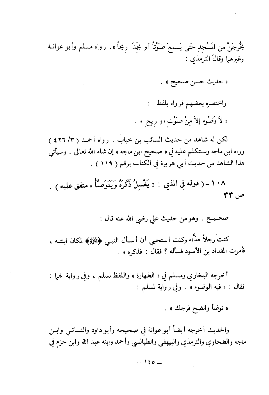 (108) - (قوله فى المذى: " يغسل ذكره ويتوضأ ". متفق عليه (ص 33) .