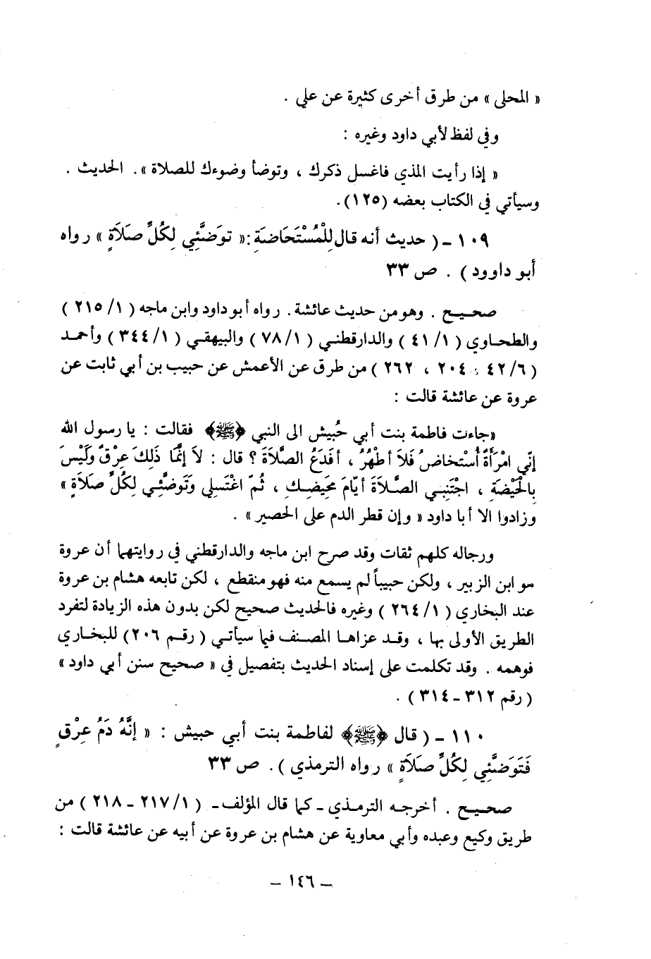(110) - (قال صلى الله عليه وسلم لفاطمة بنت أبى حبيش: " إنه دم عرق فتوضئى لكل صلاة ". رواه الترمذى (ص 33) .