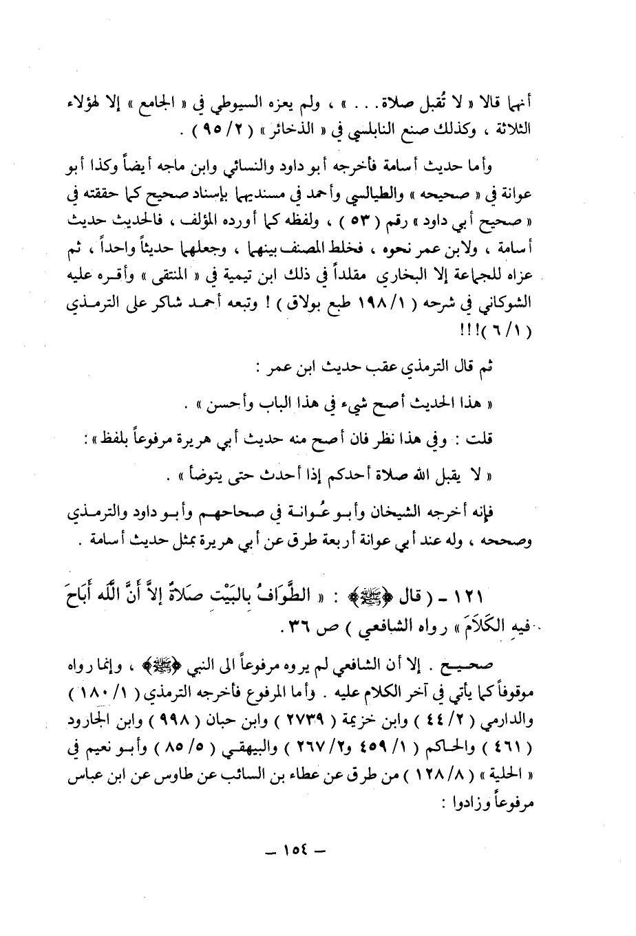 (121) - (قال صلى الله عليه وسلم: " الطواف بالبيت صلاة إلا أن الله أباح فيه الكلام ". رواه الشافعى (ص 36) .