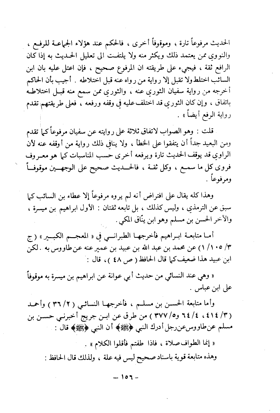 وأما متابعة الحسن بن مسلم , فأخرجها النسائى (2/36) وأحمد (3/414 , 4/64 و5/377) من طرق عن ابن جريج أخبرنى حسن بن مسلم عن طاوس عن رجل أدرك النبى صلى الله عليه وسلم أن النبى صلى الله عليه وسلم قال: " إنما الطواف صلاة , فاذا طفتم فأقلوا الكلام ".