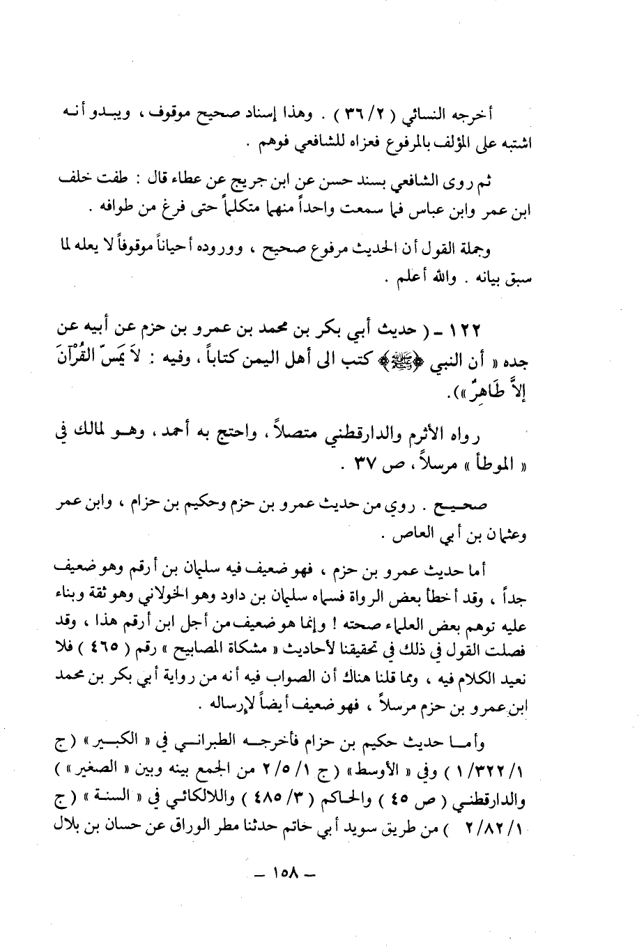 (122) - (حديث أبى بكر بن محمد بن عمرو بن حزم عن أبيه عن جده: " أن النبى صلى الله عليه وسلم كتب إلى أهل اليمن كتابا , وفيه: لا يمس القرآن إلا طاهر ". رواه الأثرم والدارقطنى متصلا , واحتج به أحمد , وهو لمالك فى " الموطأ " مرسلا (ص 37) .