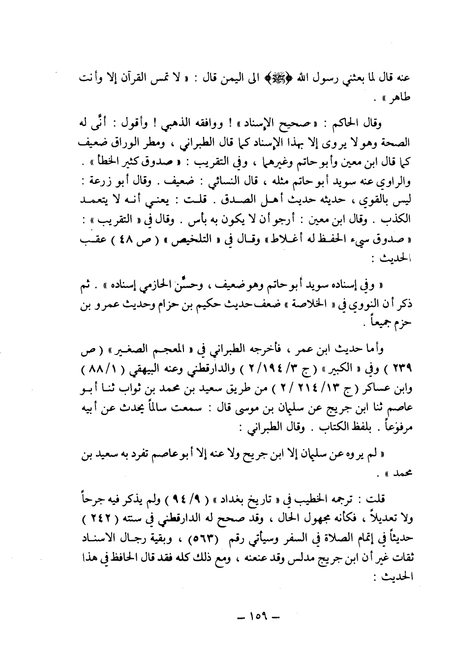 وقال ابن معين: أرجو أن لا يكون به بأس , وقال فى " التقريب ": " صدوق سىء الحفظ له أغلاط " وقال فى " التلخيص " (ص 48) عقب الحديث: " وفى إسناده سويد أبو حاتم وهو ضعيف , وحسن الحازمى إسناده ". ثم ذكر أن النووى فى " الخلاصة " ضعف حديث حكيم بن حزام وحديث عمرو بن حزم جميعا.