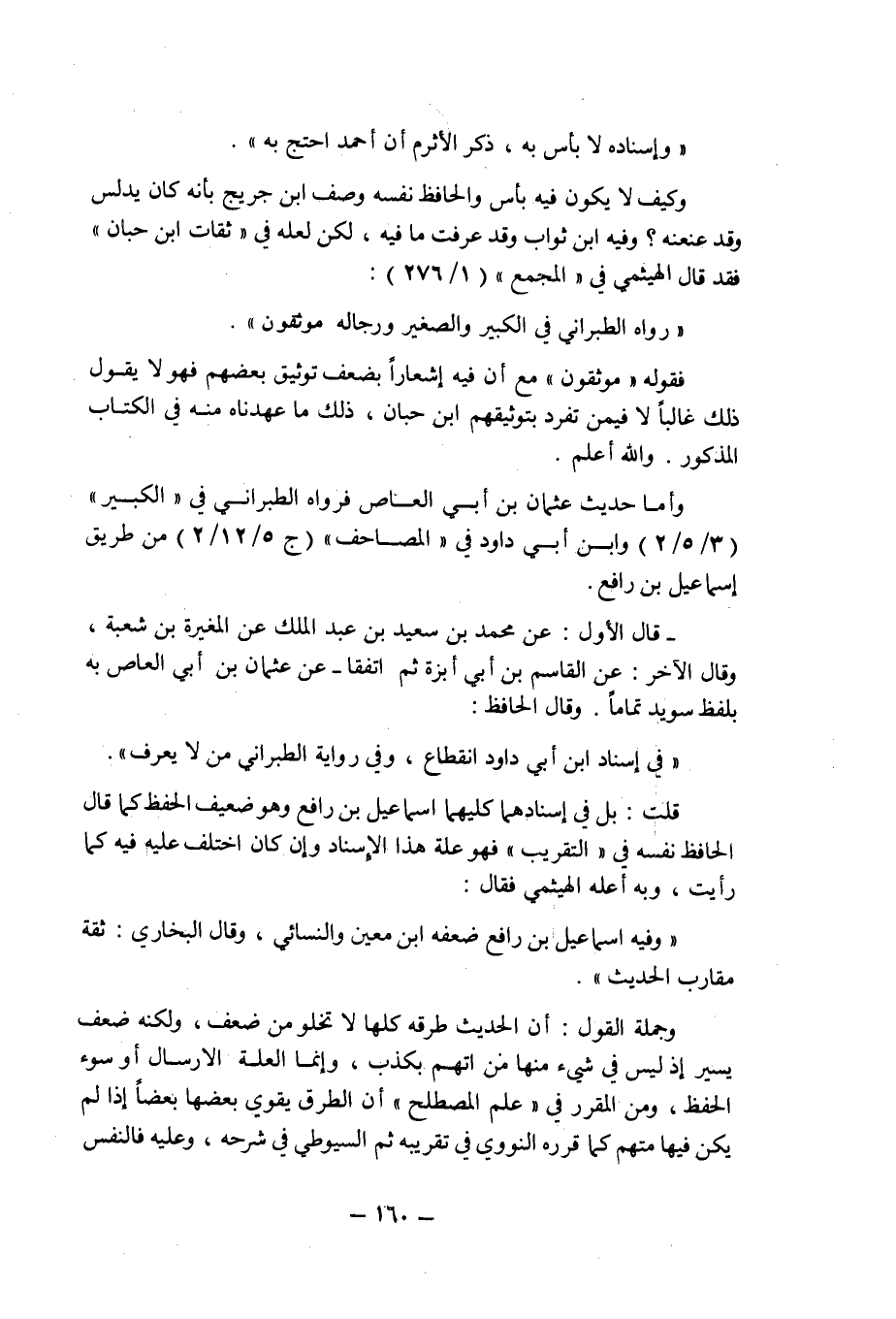 وفيه ابن ثواب وقد عرفت ما فيه , لكن لعله فى " ثقات ابن حبان " [1] فقد قال الهيثمى فى " المجمع " (1/276) : " رواه الطبرانى فى الكبير والصغير ورجاله موثقون ". فقوله " موثقون " (مع أن فيه إشعارا) [2] بضعف توثيق بعضهم فهو لا يقول ذلك غالبا لا [3] فيمن تفرد بتوثيقهم ابن حبان , ذلك ما عهدناه منه فى الكتاب المذكور , والله أعلم.