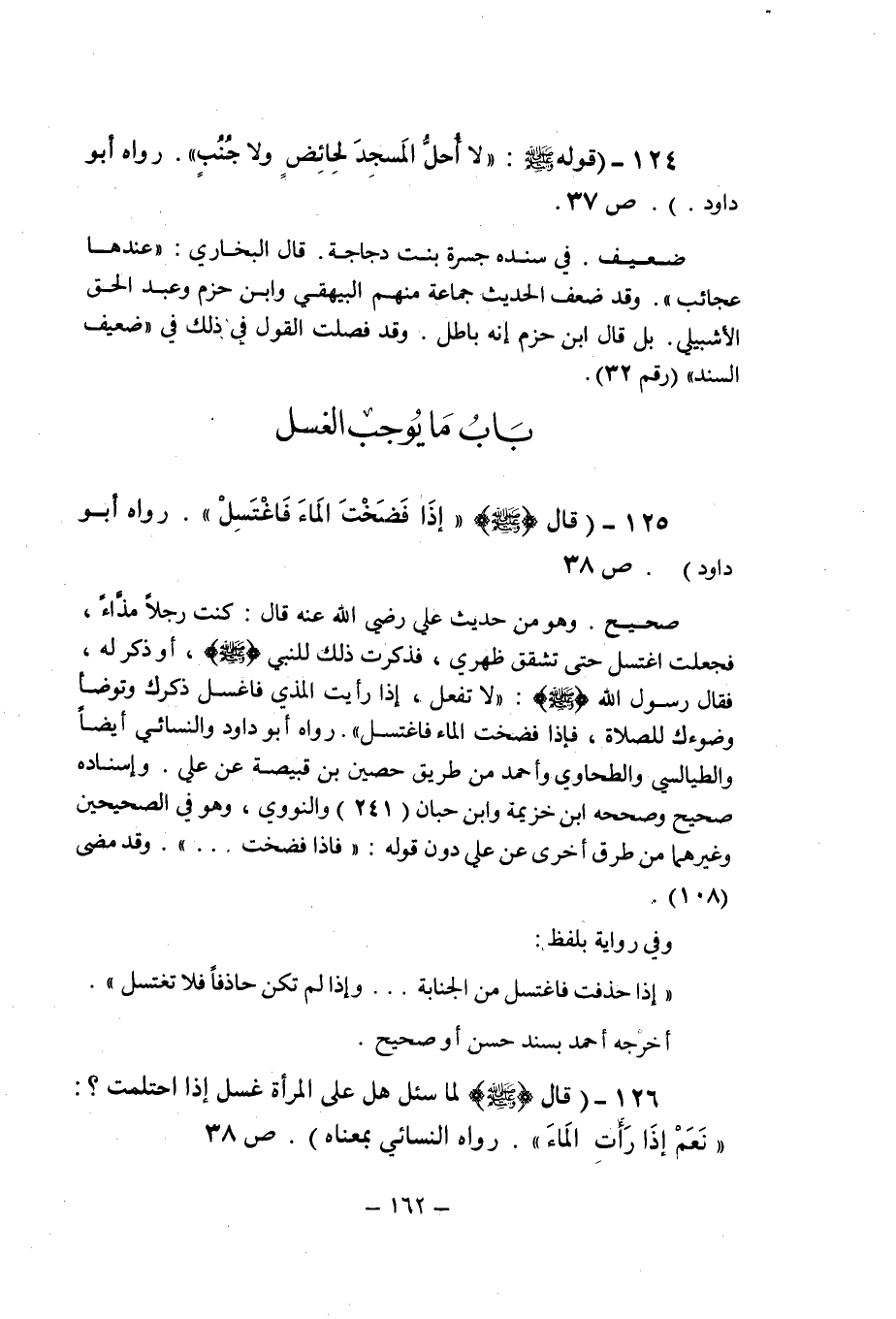 (126) - (قال صلى الله عليه وسلم - لما سئل هل على المرأة غسل إذا احتلمت؟ -: " نعم إذا رأت الماء ". رواه النسائى بمعناه (ص 38) .
