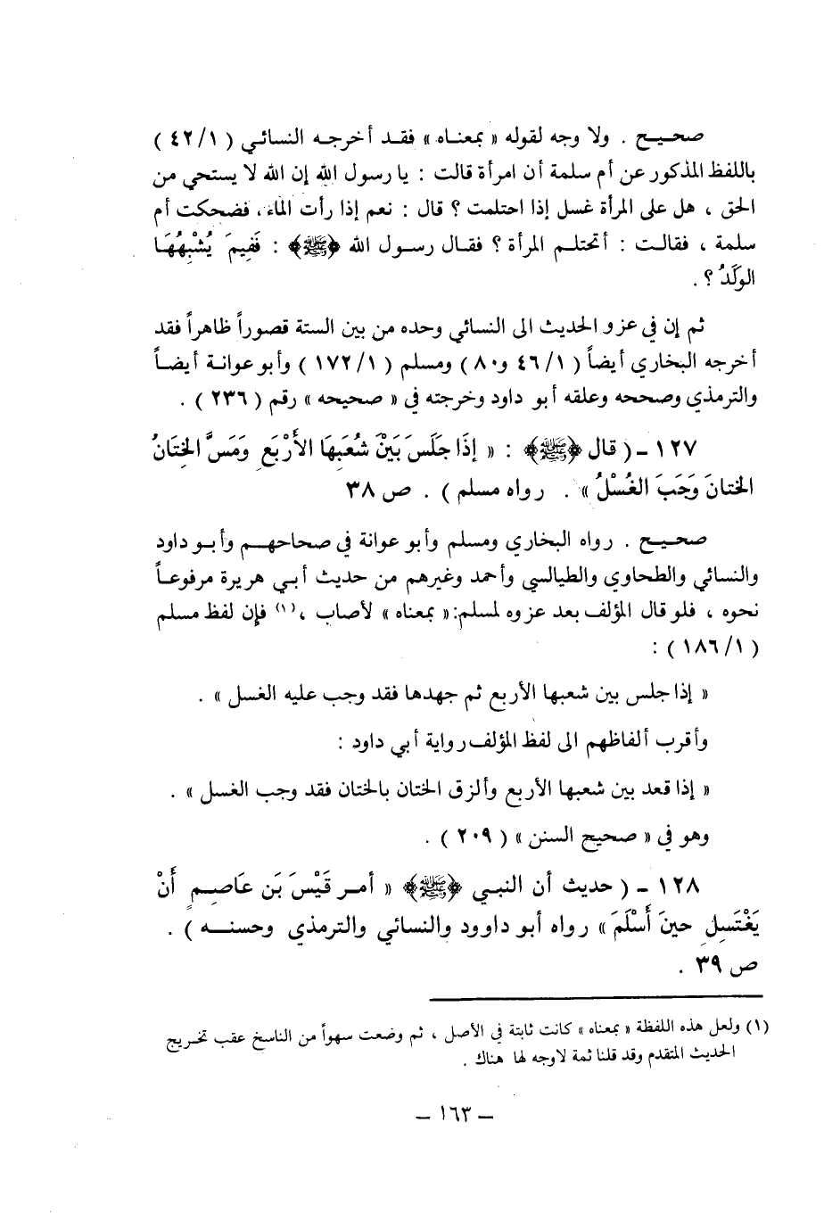 (127) - (قال صلى الله عليه وسلم: " إذا جلس بين شعبها الأربع ومس الختان الختان وجب الغسل ". رواه مسلم (ص 38) .