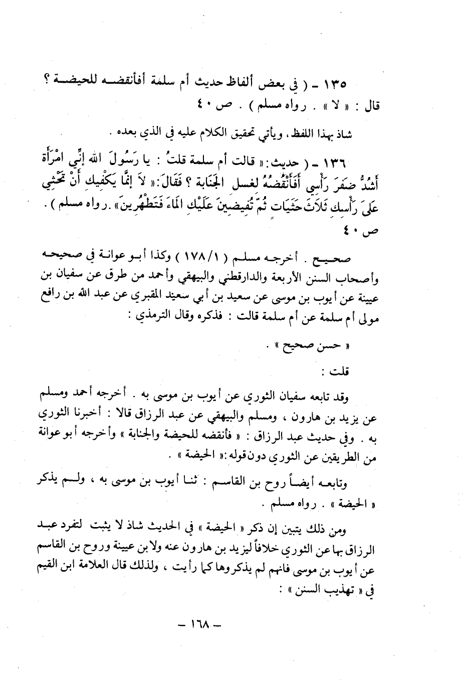 (135) - (فى بعض ألفاظ حديث أم سلمة أفأنقضه للحيضة؟ قال: " لا ". رواه مسلم (ص 40)