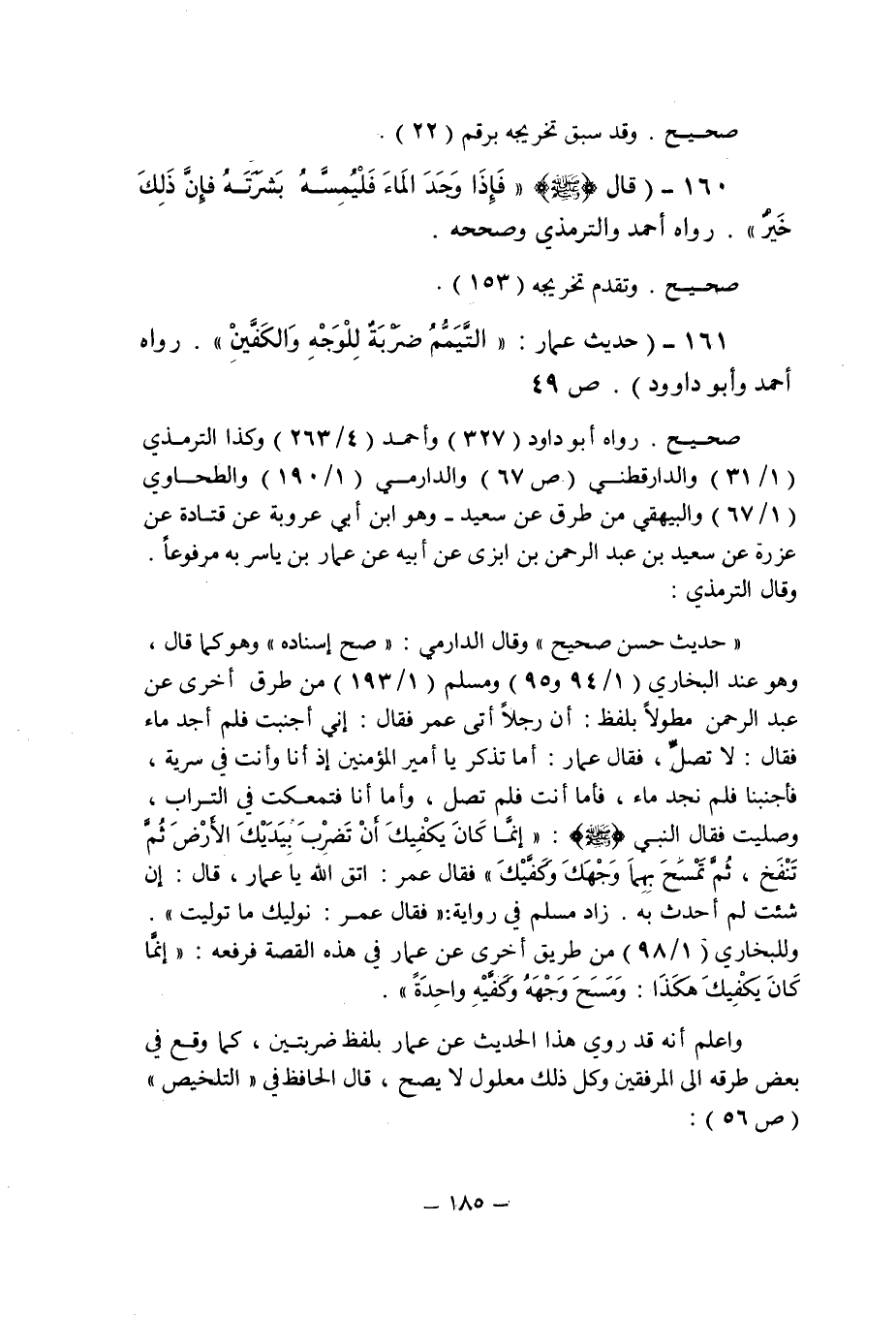 (161) - (حديث عمار: " التيمم ضربة للوجه والكفين ". رواه أحمد وأبو داوود (ص 49) .