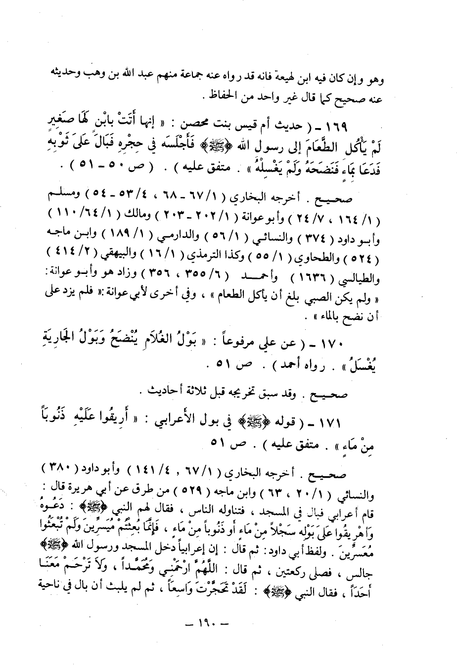 (169) - (حديث أم قيس بنت محصن: " أنها أتت بابن لها صغير لم يأكل الطعام إلى رسول الله صلى الله عليه وسلم فأجلسه فى حجره فبال على ثوبه فدعا بماء فنضحه ولم يغسله ". متفق عليه (ص50 ـ 51)