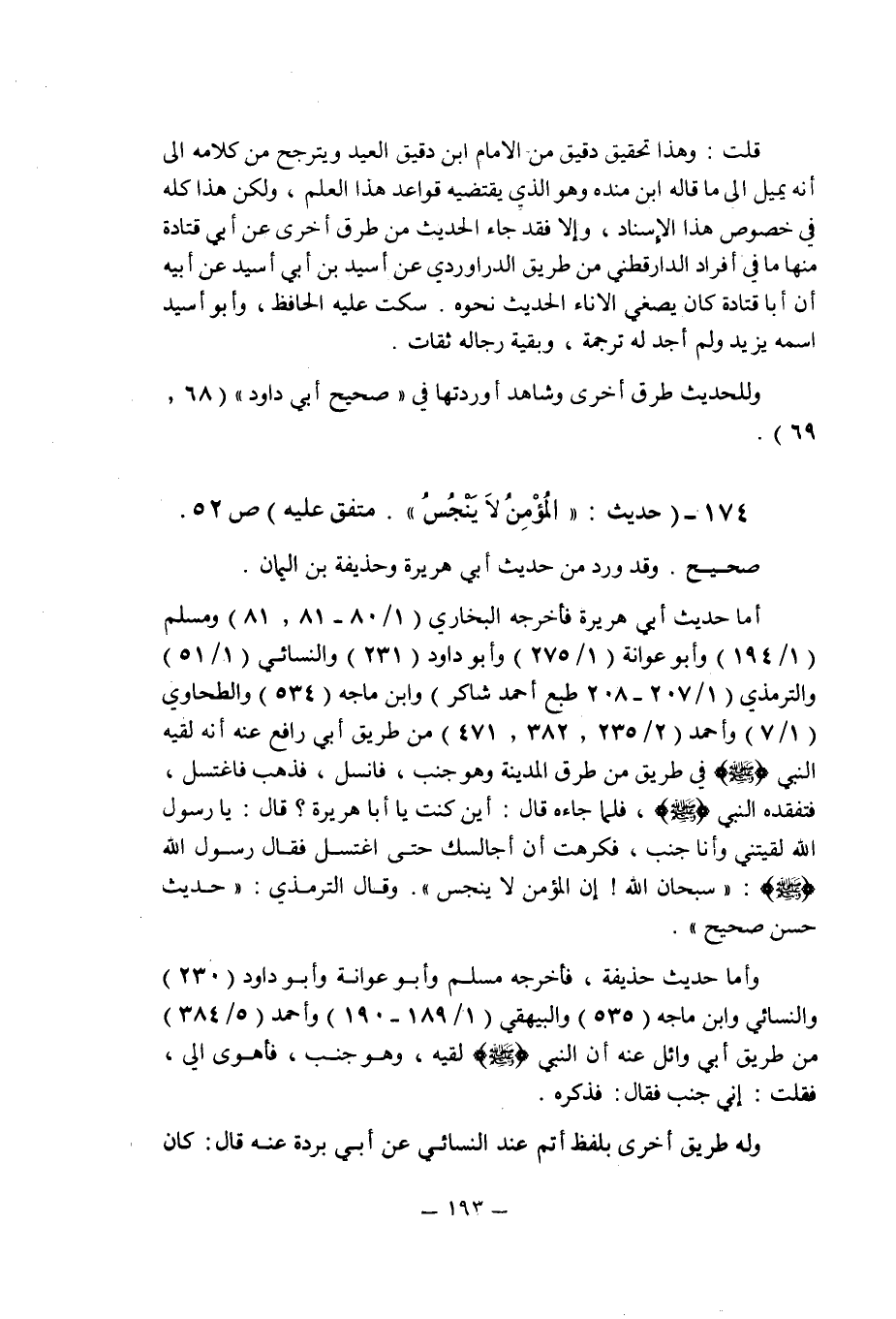 (174) - (حديث: " المؤمن لا ينجس ". متفق عليه (ص52) .
