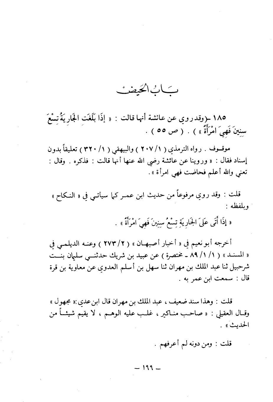 (185) - (وقد روى عن عائشة أنها قالت: " إذا بلغت الجارية تسع سنين فهى امرأة ". ص 55