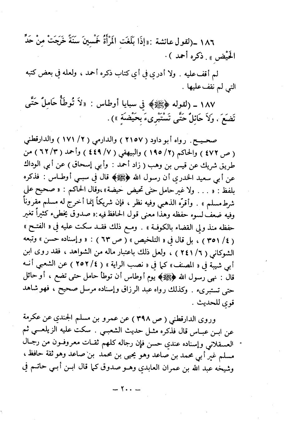 (187) - (لقوله صلى الله عليه وسلم فى سبايا أوطاس: " لا توطأ حامل حتى تضع , ولا حائل حتى تستبرىء بحيضة ". ص 55