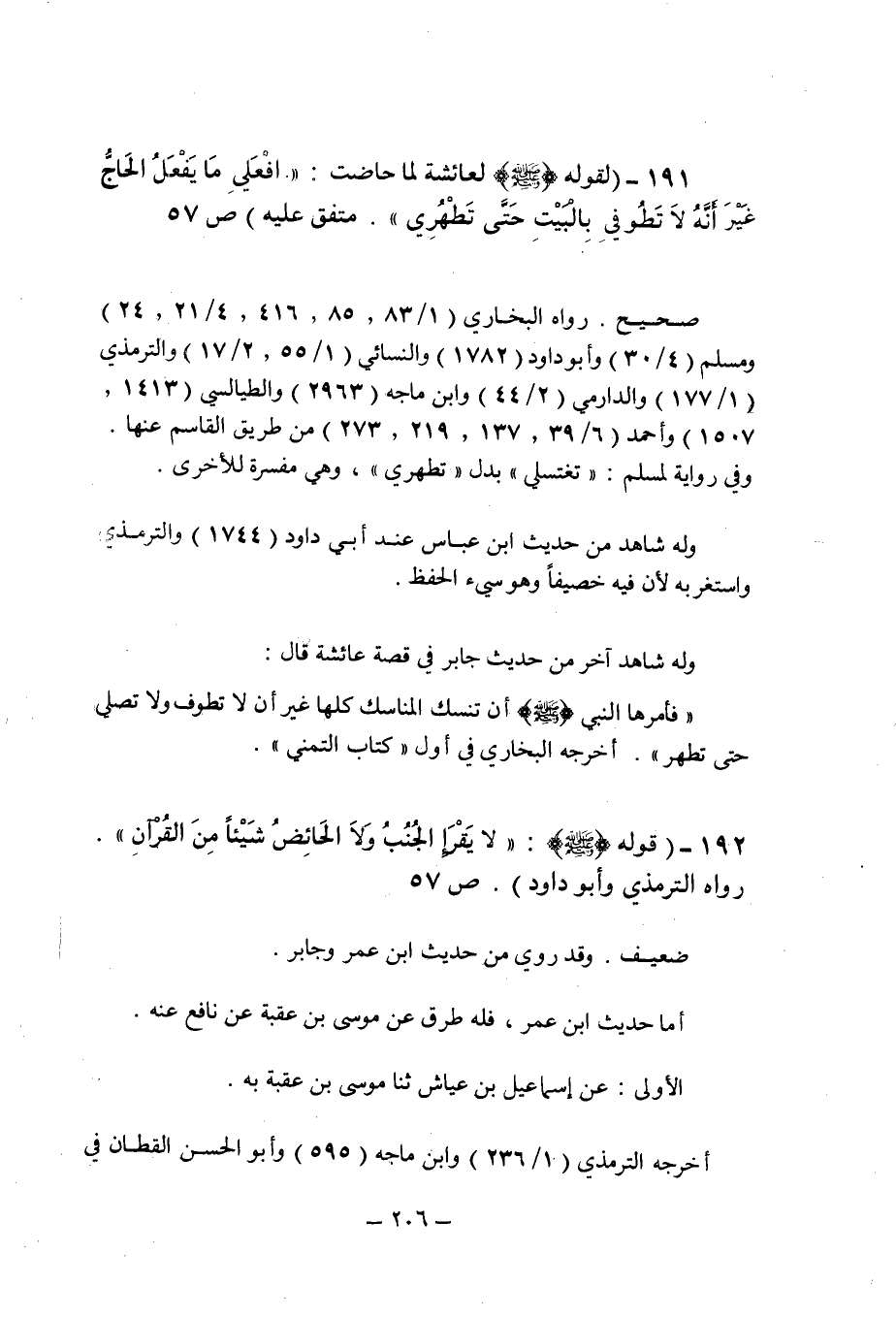 (191) - (لقوله صلى الله عليه وسلم لعائشة لما حاضت: " افعلى ما يفعل الحاج غير أنه لا تطوفى بالبيت حتى تطهرى ". متفق عليه (ص 57) .