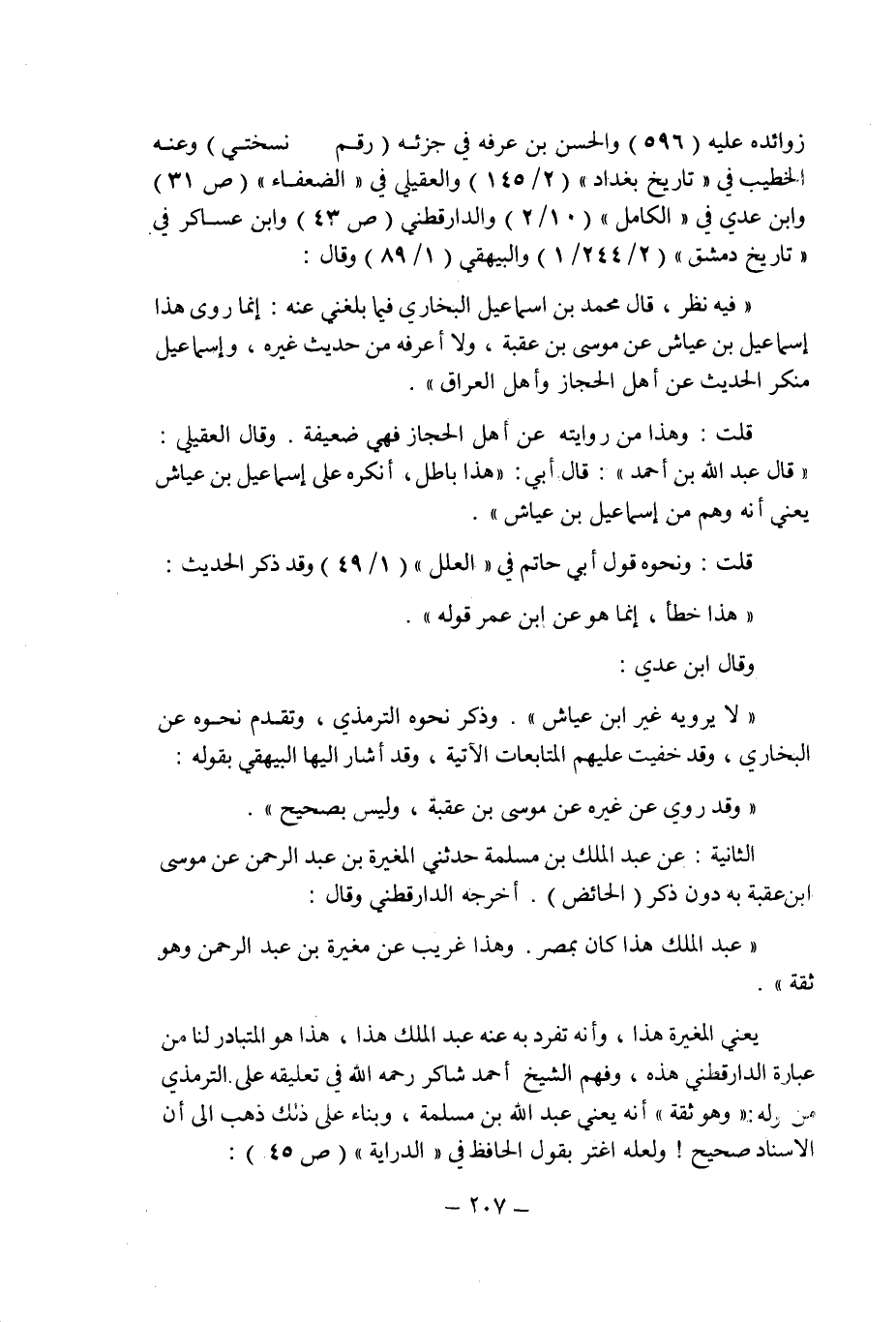 زوائده عليه (596) والحسن بن عرفة في جزئه (رقم نسختي) وعنه الخطيب في " تاريخ بغداد " (2/145) والعقيلي في " الضعفاء " (ص 31) وابن عدي في " الكامل " (10/2) والدارقطني (ص 43) وابن عساكر في " تاريخ دمشق " (2/244/1) والبيهقي (1/89) وقال: فيه نظر , قال محمد بن إسماعيل البخاري فيما بلغني عنه: إنما روى هذا إسماعيل بن عياش عن موسى بن عقبة , ولا أعرفه من حديث غيره, وإسماعيل منكر الحديث عن أهل الحجاز وأهل العراق.