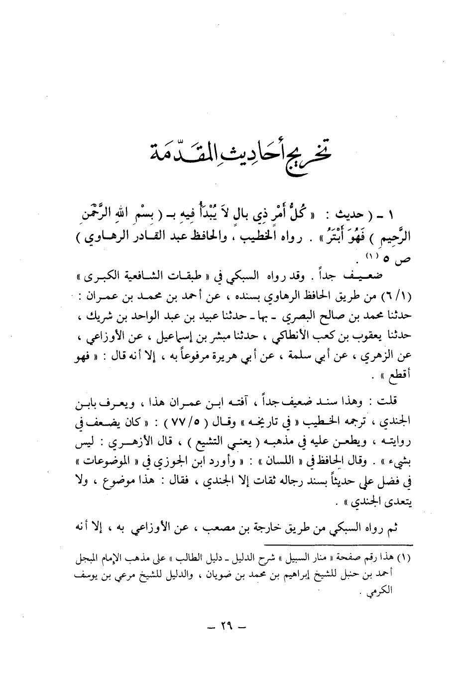 (1) - (حديث: "كل أمر ذي بال لا يبدأ فيه ببسم الله الرحمن الرحيم فهو أبتر". رواه الخطيب، والحافظ عبد القادر الرهاوي ص 5 (1) .