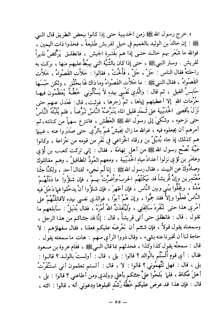 خرج رسول الله صلى الله عليه وسلم زمن الحديبية حتى إذا كانوا ببعض الطريق قال النبى صلى الله عليه وسلم: إن خالد بن الوليد بالغميم فى خيل لقريش طليعة , فخذوا ذات اليمين , فوالله ما شعر بهم خالد حتى إذا هم بقترة الجيش , فانطلق يركض نذيرا لقريش , وسار النبى صلى الله عليه وسلم , حتى إذا كان بالثنية التى يهبط عليهم منها , بركت به راحلته فقال الناس: حل , حل , فألحت , فقالوا: خلأت القصواء , خلأت القصواء , فقال النبى صلى الله عليه وسلم: ما خلأت القصواء وماذاك لها بخلق , ولكن حبسها حابس الفيل , ثم قال: والذى نفسى بيده لا يسألونى خطة يعظمون فيها حرمات الله إلا أعطيتهم إياها , ثم زجرها , فوثبت , قال: فعدل عنهم حتى نزل بأقصى الحديبية على ثمد قليل الماء يتبرضه الناس تبرضا , فلم يلبثه الناس حتى نزحوه , وشكى إلى رسول الله صلى الله عليه وسلم العطش , فانتزع سهما من كنانته , ثم أمرهم أن يجعلوه فيه , فوالله مازال يجيش لهم بالرى حتى صدروا عنه , فبينما هم كذلك إذ جاء بديل بن ورقاء الخزاعى فى نفر من قومه من خزاعة , وكانوا عيبة نصح رسول الله صلى الله عليه وسلم من أهل تهامة , فقال: إنى تركت كعب بن لؤى وعامر بن لؤى نزلوا أعداد مياه الحديبية , ومعهم العوذ المطافيل , وهم مقاتلوك وصادوك عن البيت , فقال رسول الله صلى الله عليه وسلم: إنا لم نجىء لقتال أحد ولكنا جئنا معتمرين وإن قريشا قد نهكتهم الحرب , وأضرت بهم , فإن شاؤوا ماددتهم مدة , ويخلوا بينى وبين الناس , فإن أظهر , فإن شاؤوا أن يدخلوا فيما دخل فيه الناس فعلوا وإلا فقد جموا , وإن هم أبوا , فوالذى نفسى بيده لأقاتلنهم على أمرى هذا حتى تنفرد سالفتى , ولينفذن الله أمره , فقال بديل: سأبلغهم ما تقول , قال: فانطلق حتى أتى قريشا , قال: إنا قد جئناكم من هذا الرجل , وسمعناه يقول قولا , فإن شئتم أن نعرضه عليكم فعلنا , فقال سفهاؤهم: لا حاجة لنا أن تخبرنا عنه بشىء , وقال ذووا الرأى منهم: هات ما سمعته يقول. قال: سمعته يقول كذا وكذا , فحدثهم بما قال النبى صلى الله عليه وسلم , فقام عروة بن مسعود فقال: أى قوم ألستم بالوالد؟ قالوا: بلى , قال: أولست بالولد؟ قالوا: بلى , قال: فهل تتهمونى؟ قالوا: لا , قال: ألستم تعلمون أنى استنفرت أهل عكاظ , فلما بلحوا على جئتكم بأهلى وولدى ومن أطاعنى؟ قالوا: بلى , قال: فإن هذا قد عرض عليكم خطة رشد اقبلوها ودعونى آته , قالوا: ائته ,