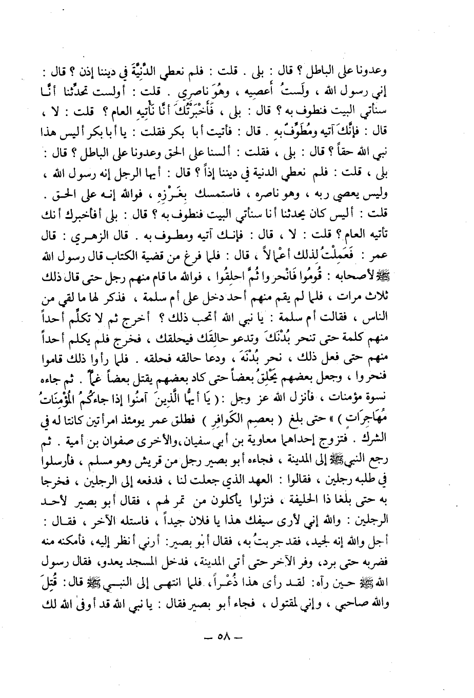 وعدونا على الباطل؟ قال: بلى , قلت: فلم نعطى الدنية فى ديننا إذن؟ قال: إنى رسول الله , ولست أعصيه , وهو ناصرى , قلت: أولست تحدثنا أنا سنأتى البيت فنطوف به؟ قال: بلى , أفأخبرتك أنا نأتيه العام؟ قلت: لا , قال: فإنك آتيه ومطوف به , قال: فأتيت أبا بكر فقلت: يا أبا بكر أليس هذا نبى الله حقا؟ قال: بلى , فقلت: ألسنا على الحق وعدونا على الباطل؟ قال: بلى. قلت: فلم نعطى الدنية فى ديننا إذا؟ قال: أيها الرجل إنه رسول الله , وليس يعصى ربه , وهو ناصره , فاستمسك بغرزه , فوالله إنه على الحق. قلت: أليس كان يحدثنا أنا سنأتى البيت فنطوف به؟ قال: بلى أفأخبرك أنك تأتيه العام؟ قلت: لا , قال: فإنك آتيه ومطوف به , - قال الزهرى: قال عمر: فعملت لذلك أعمالا , - قال: فلما فرغ من قضية الكتاب قال رسول الله صلى الله عليه وسلم لأصحابه: قوموا فانحروا ثم احلقوا , فوالله ما قام منهم رجل قال ذلك ثلاث مرات , فلما لم يقم منهم أحد دخل على أم سلمة , فذكر لها ما لقى من الناس , فقالت أم سلمة: يا نبى الله أتحب ذلك؟ اخرج ثم لا تكلم أحدا منهم كلمة حتى تنحر بدنك وتدعو حالقك فيحلقك , فخرج فلم يكلم أحدا منهم حتى فعل ذلك , نحر بدنه , ودعا حالقه فحلقه. فلما رأوا ذلك قاموا فنحروا , وجعل بعضهم يحلق بعضا حتى كاد بعضهم يقتل بعضا غما. ثم جاءه نسوة مؤمنات , فأنزل الله عز وجل: (يا أيها الذين آمنوا إذا جاءكم المؤمنات مهاجرات) حتى بلغ (بعصم الكوافر) فطلق عمر يومئذ امرأتين كانتا له فى الشرك. فتزوج إحداهما معاوية بن أبى سفيان , والأخرى صفوان بن أمية. ثم رجع النبى صلى الله عليه وسلم إلى المدينة , فجاءه أبو بصير رجل من قريش وهو مسلم , فأرسلوا فى طلبه رجلين , فقالوا: العهد الذى جعلت لنا , فدفعه إلى الرجلين , فخرجا به حتى بلغا ذا الحليفة , فنزلوا يأكلون من تمر لهم , فقال أبو بصير لأحد الرجلين: والله إنى لأرى سيفك هذا يا فلان جيدا , فاستله الآخر , فقال: أجل والله إنه لجيد , فقد جربت به , فقال أبو بصير: أرنى أنظر إليه , فأمكنه منه فضربه حتى برد , وفر الآخر حتى أتى المدينة , فدخل المسجد يعدو , فقال رسول الله صلى الله عليه وسلم حين رآه: لقد رأى هذا ذعرا , فلما انتهى إلى النبى صلى الله عليه وسلم قال: قتل والله صاحبى , وإنى لمقتول , فجاء أبو بصير فقال: يا نبى الله قد أوفى الله لك