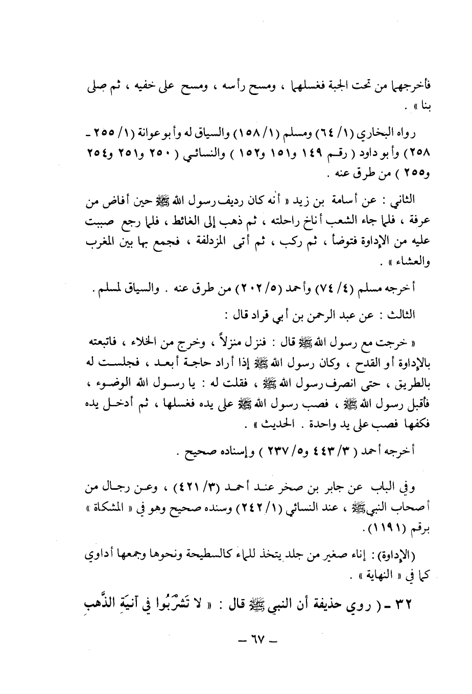 الثالث: عن عبد الرحمن بن أبى قراد قال: " خرجت مع رسول الله صلى الله عليه وسلم قال: فنزل منزلا , وخرج من الخلاء , فاتبعته بالإداوة أو القدح , وكان رسول الله صلى الله عليه وسلم إذا أراد حاجة أبعد , فجلست له بالطريق , حتى انصرف رسول الله صلى الله عليه وسلم , فقلت له: يا رسول الله الوضوء , فأقبل رسول الله صلى الله عليه وسلم , فصب رسول الله صلى الله عليه وسلم على يده فغسلها , ثم أدخل يده فكفها فصب على يد واحدة ... " الحديث.