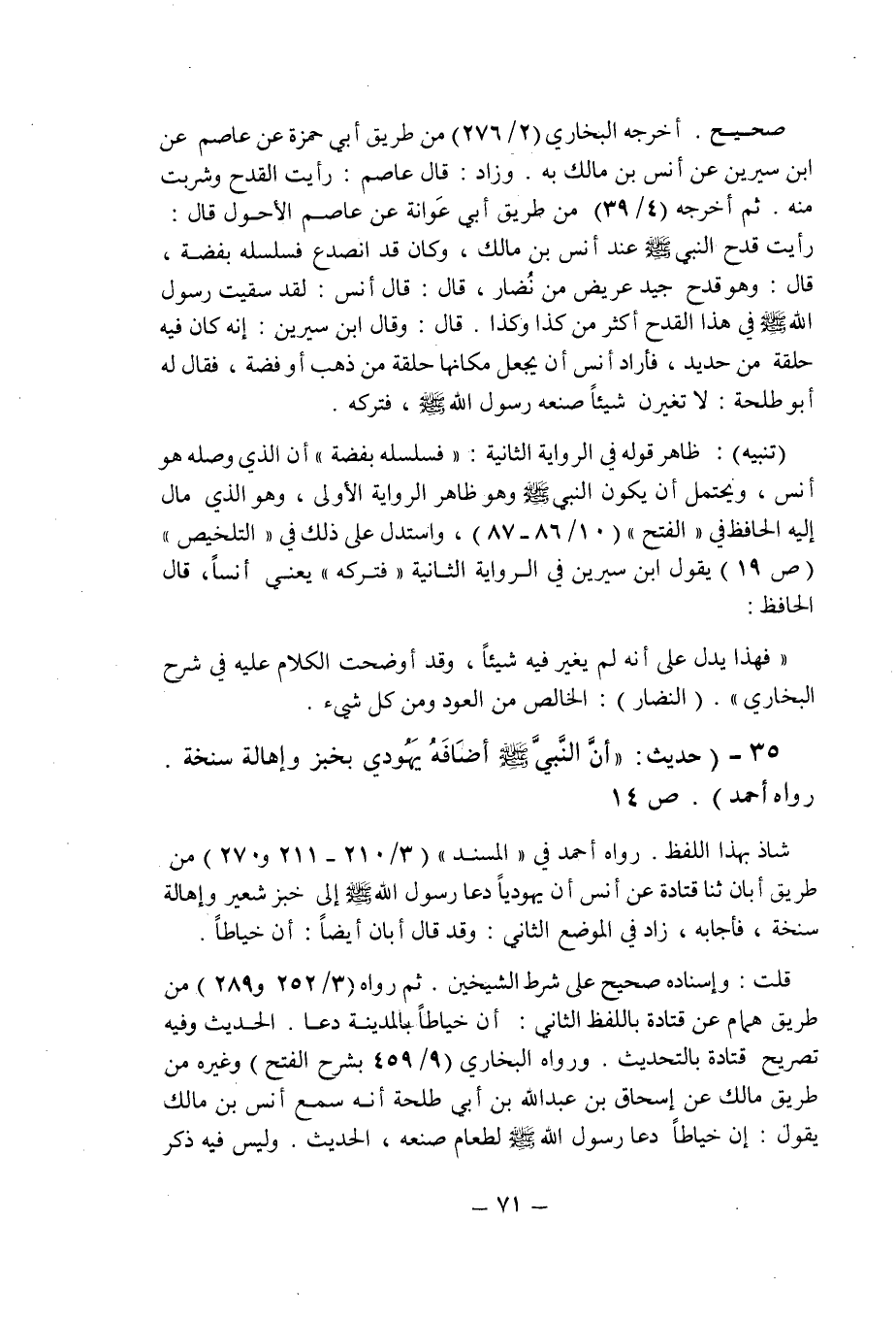 (تنبيه) : ظاهر قوله فى الرواية الثانية: " فسلسله بفضة " أن الذى وصله هو أنس , ويحتمل أن يكون النبى صلى الله عليه وسلم وهو ظاهر الرواية الأولى , وهو الذى مال إليه الحافظ فى " الفتح " (10/86 ـ 87) , واستدل على ذلك فى " التلخيص " (ص 19) يقول [1] ابن سيرين فى الرواية الثانية: فتركه - يعنى أنسا -.