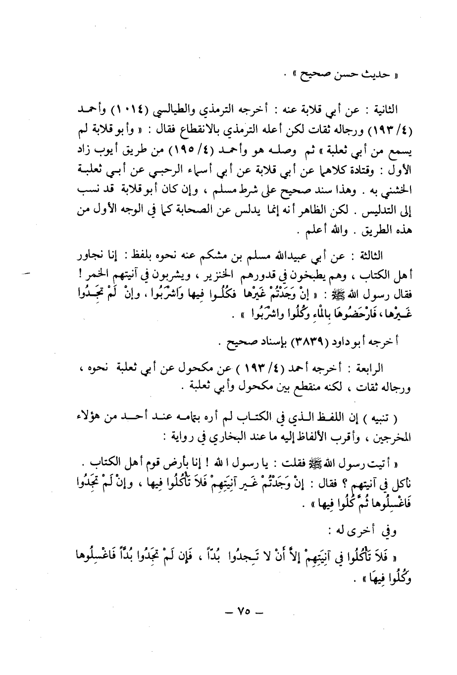 الثالثة: عن أبى عبيد الله مسلم بن مشكم عنه نحوه بلفظ: إنا نجاور أهل الكتاب , وهم يطبخون فى قدورهم الخنزير , ويشربون فى آنيتهم الخمر! فقال رسول الله صلى الله عليه وسلم: " إن وجدتم غيرها فكلوا فيها واشربوا , وإن لم تجدوا غيرها , فارحضوها بالماء وكلوا واشربوا ".