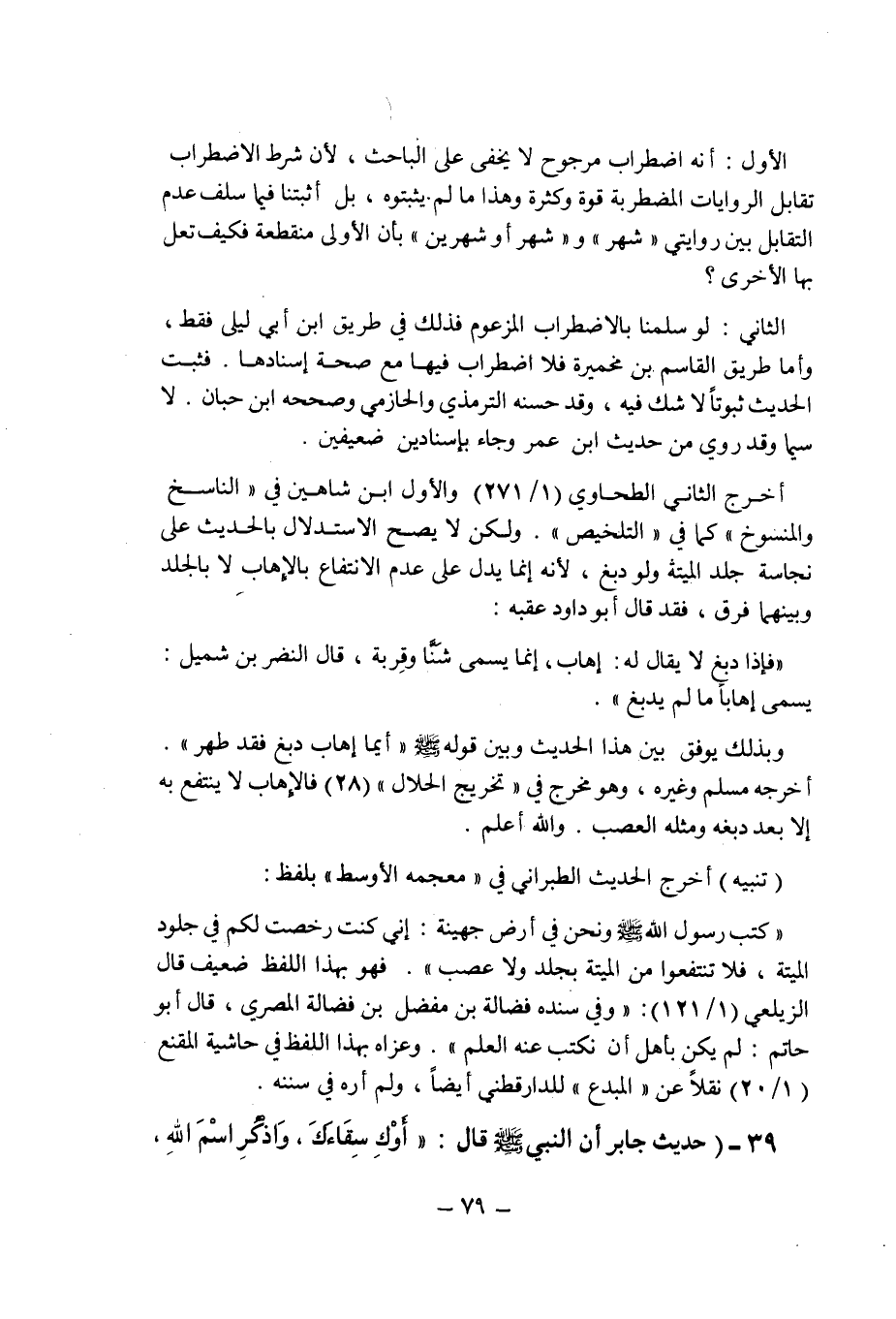 أخرج الثانى الطحاوى (1/271) والأول ابن شاهين فى " الناسخ والمنسوخ " كما فى " التلخيص " ولكن لا يصح الاستدلال بالحديث على نجاسة جلد الميتة ولو دبغ , لأنه إنما يدل على عدم الأنتفاع بالإهاب لا بالجلد وبينهما فرق. فقد قال أبو داود عقبه:" فإذا دبغ لا يقال له: إهاب , إنما يسمى شنا وقربة.