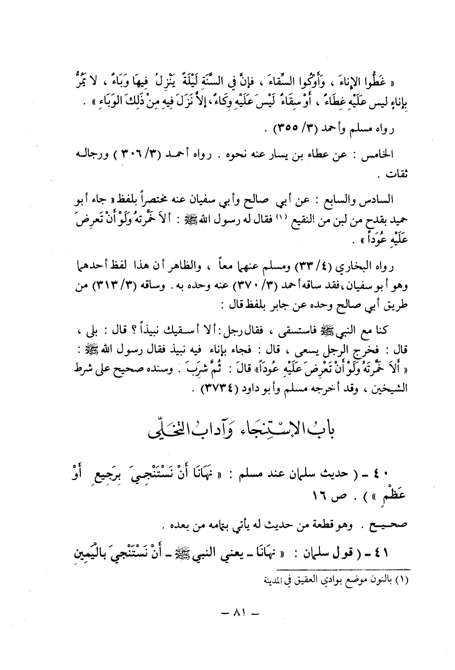 (40) - (حديث سلمان عند مسلم: " نهانا أن نستنجى برجيع أو عظم " (ص 16) .