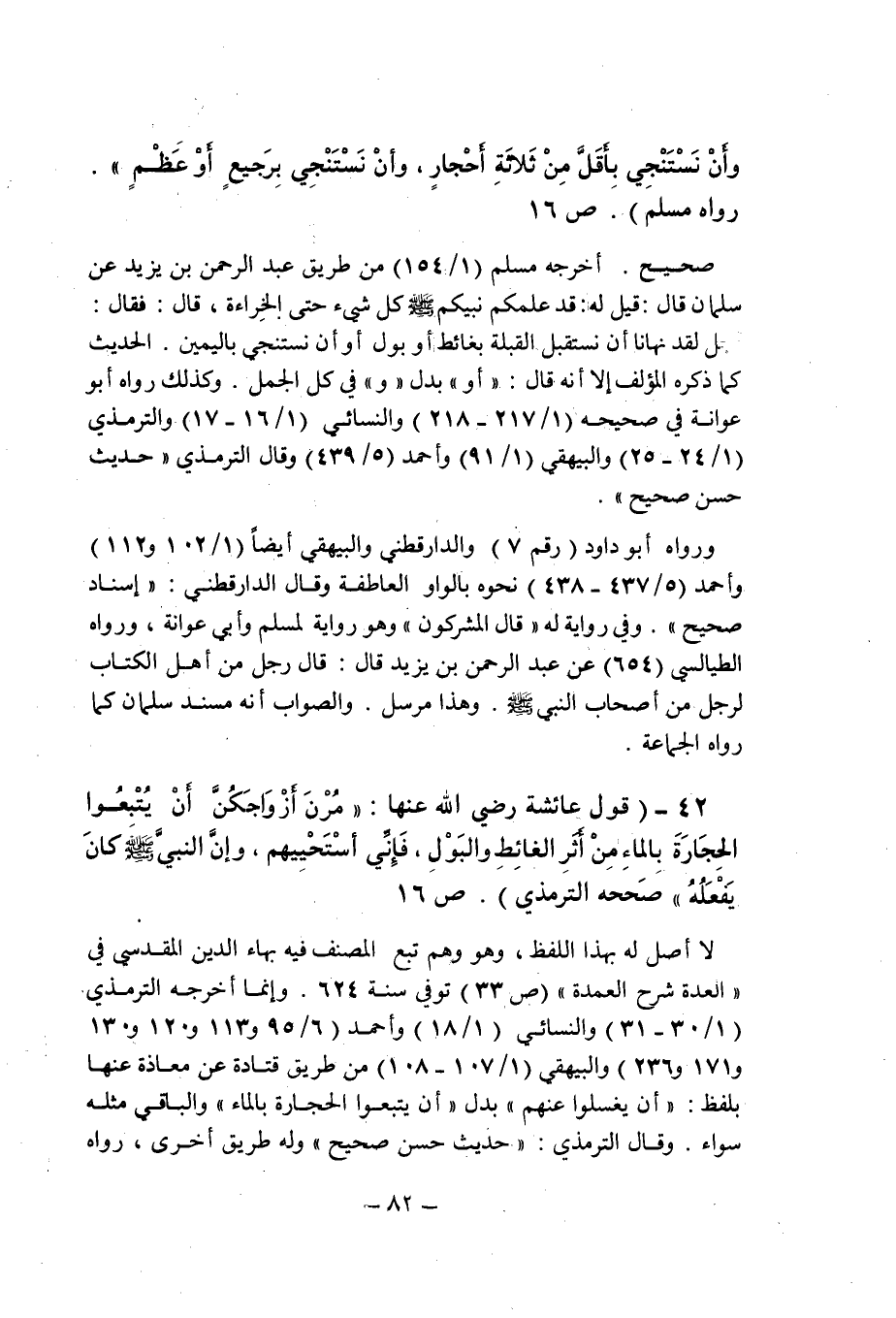 (42) - (قول عائشة رضى الله عنها: " مرن أزواجكن أن يتبعوا الحجارة بالماء من أثر الغائط والبول , فإنى أستحييهم , وإن النبى صلى الله عليه وسلم كان يفعله ") . صححه الترمذى (ص 16) .