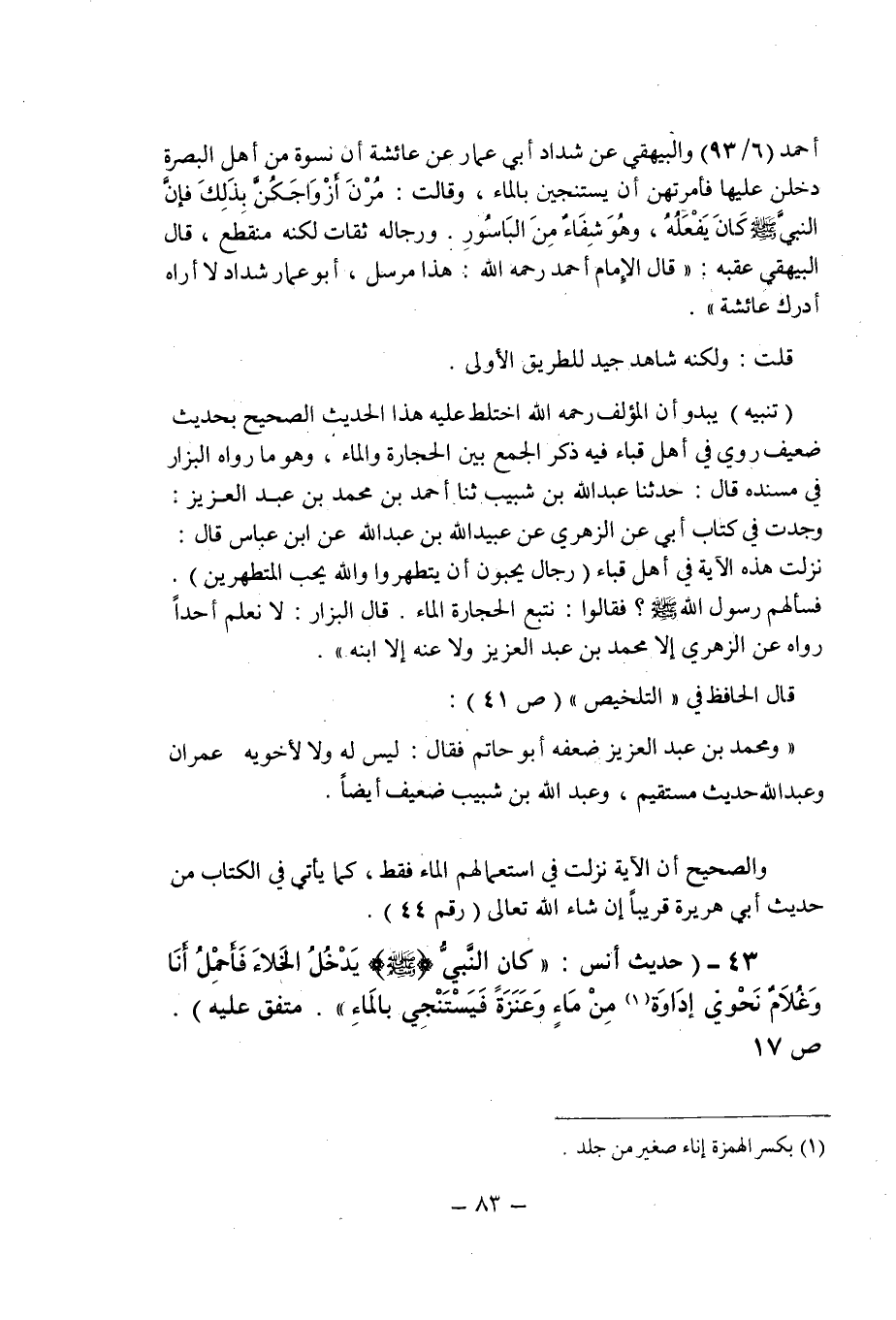 (تنبيه) يبدو أن المؤلف رحمه الله اختلط عليه هذا الحديث الصحيح بحديث ضعيف روى فى أهل قباء فيه ذكر الجمع بين الحجارة والماء , وهو ما رواه البزار فى مسنده قال: حدثنا عبد الله بن شبيب حدثنا أحمد بن محمد بن عبد العزيز: وجدت فى كتاب أبى عن الزهرى عن عبيد الله بن عبد الله عن ابن عباس قال: نزلت هذه الآية فى أهل قباء (رجال يحبون أن يتطهروا والله يحب المتطهرين) . فسألهم رسول الله صلى الله عليه وسلم؟ فقالوا: نتبع الحجارة الماء.