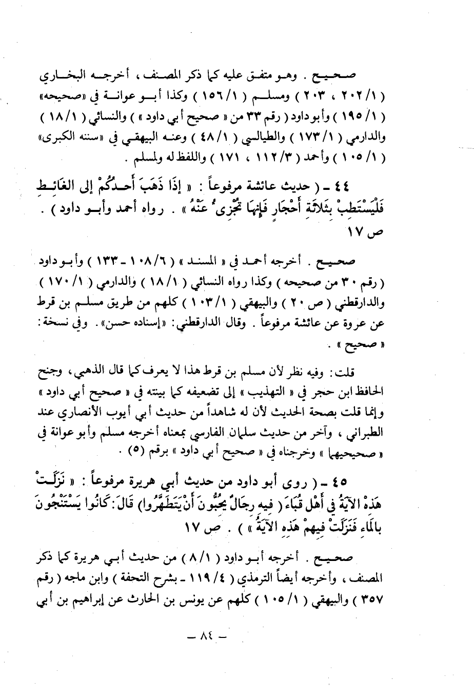 (44) - (حديث عائشة مرفوعا: " إذا ذهب أحدكم إلى الغائط فليستطب بثلاثة أحجار فإنها تجزىء عنه ". رواه أحمد وأبو داود (ص 17) .
