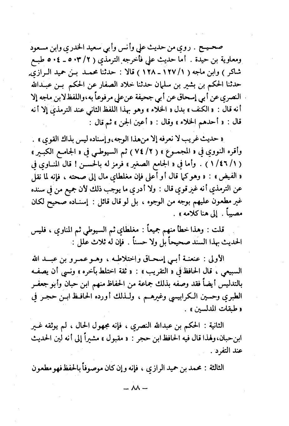 فأخرجه الترمذى (2/503 - 504 طبع شاكر) وابن ماجه (1/127 - 128) قالا: حدثنا محمد بن حميد الرازى حدثنا الحكم بن بشير بن سلمان حدثنا خلاد الصفار عن الحكم بن عبد الله النصرى عن أبى إسحاق عن أبى جحيفة عن على مرفوعا به , واللفظ لابن ماجه إلا أنه قال: " الكنف " بدل " الخلاء " وهو بهذا اللفظ.