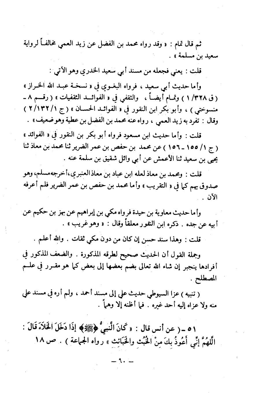 (51) - (عن أنس قال: " كان النبى صلى الله عليه وسلم إذا دخل الخلاء قال: اللهم إنى أعوذ بك من الخبث والخبائث ". رواه الجماعة (ص 18) .