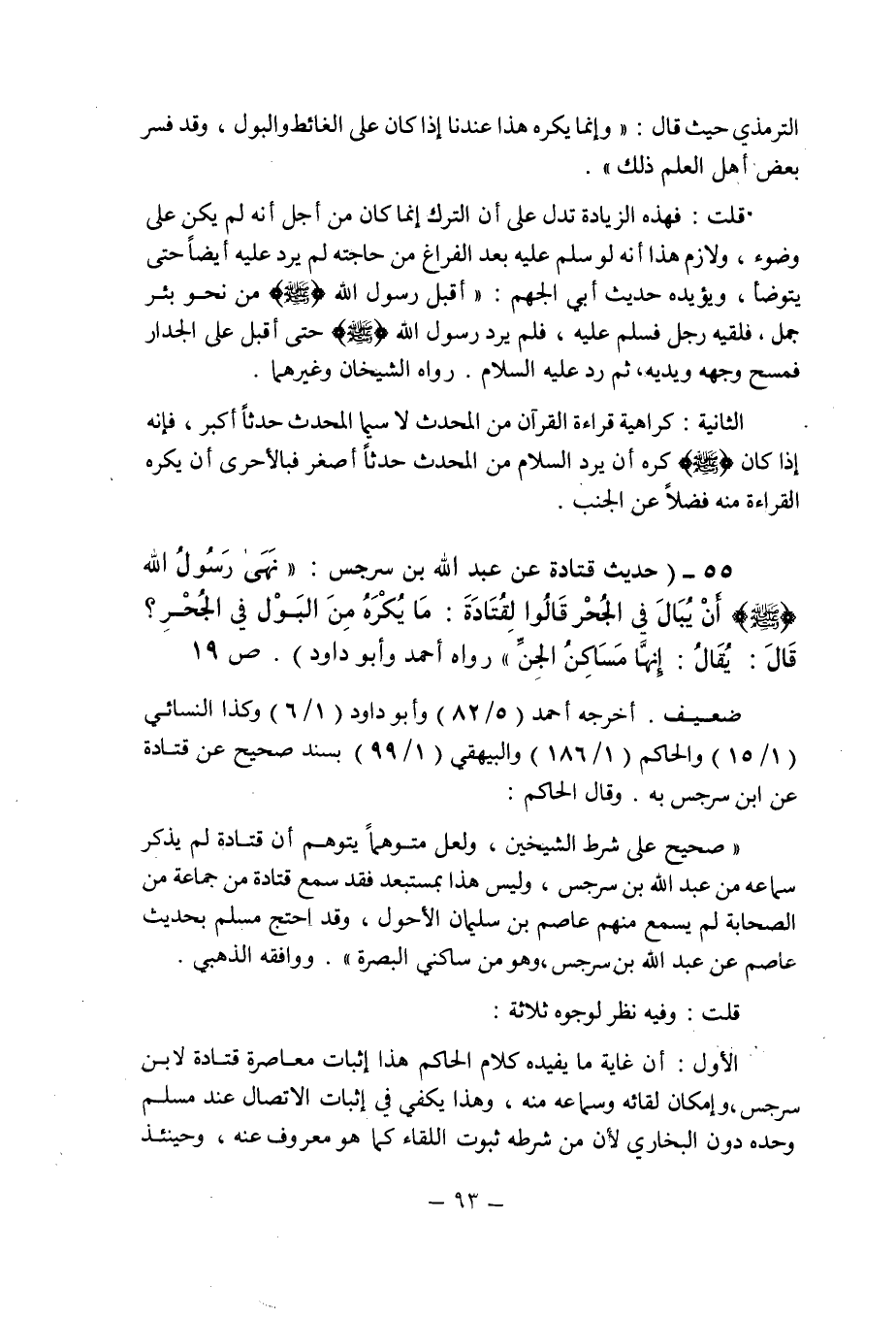 (55) - (حديث قتادة عن عبد الله بن سرجس: " نهى رسول الله صلى الله عليه وسلم أن يبال فى الجحر قالوا لقتادة: ما يكره من البول فى الجحر؟ قال: يقال: إنها مساكن الجن ". رواه أحمد وأبو داود (ص 19) .