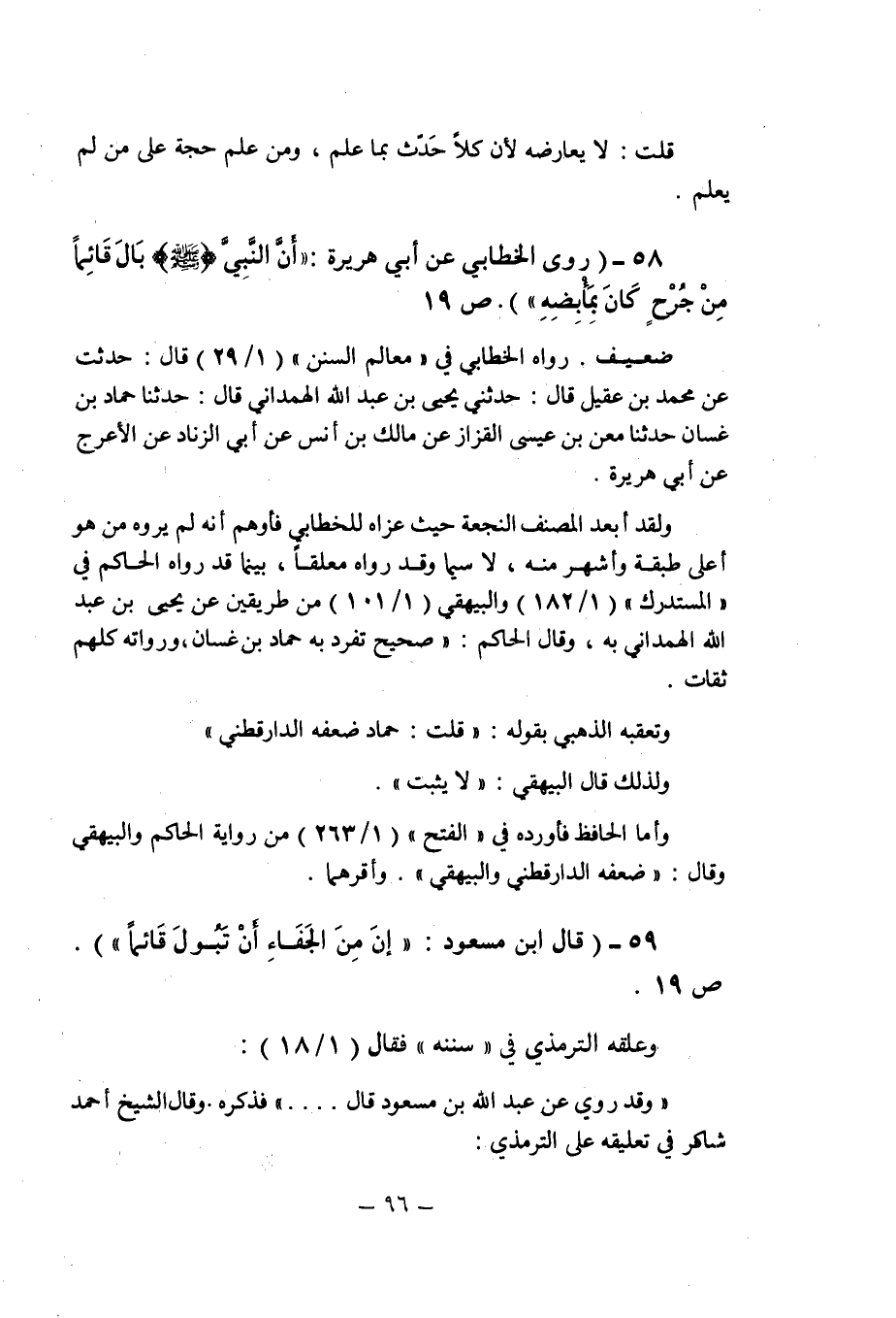 (58) - (روى الخطابى عن أبى هريرة: " أن النبى صلى الله عليه وسلم بال قائما من جرح كان بمأبضه " (ص 19) .