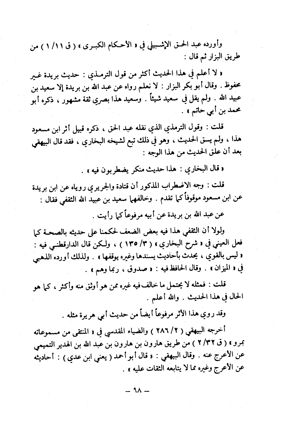 وأورده عبد الحق الإشبيلى فى " الأحكام الكبرى " (ق 11/1) من طريق البزار ثم قال: " لا أعلم فى هذا الحديث أكثر من قول الترمذى: حديث بريدة غير محفوظ.