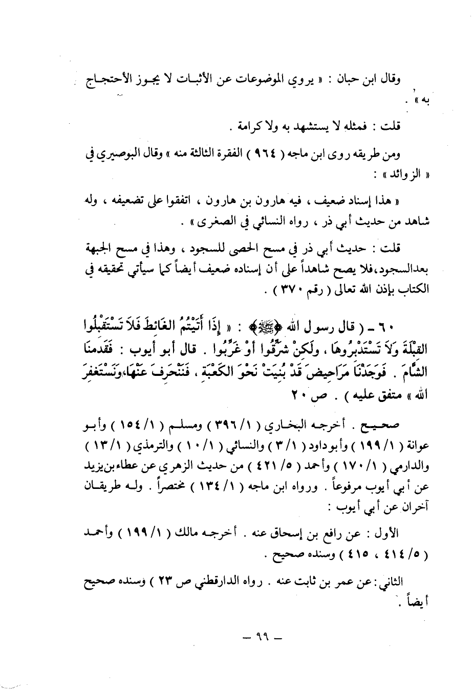(60) - (قال رسول الله صلى الله عليه وسلم: (" إذا أتيتم الغائط فلا تستقبلوا القبلة ولا تستدبروها , ولكن شرقوا أو غربوا ". قال أبو أيوب: فقدمنا الشام , فو جدنا مراحيض قد بنيت نحو الكعبة , فننحرف عنها , ونستغفر الله) . متفق عليه (ص 20) .