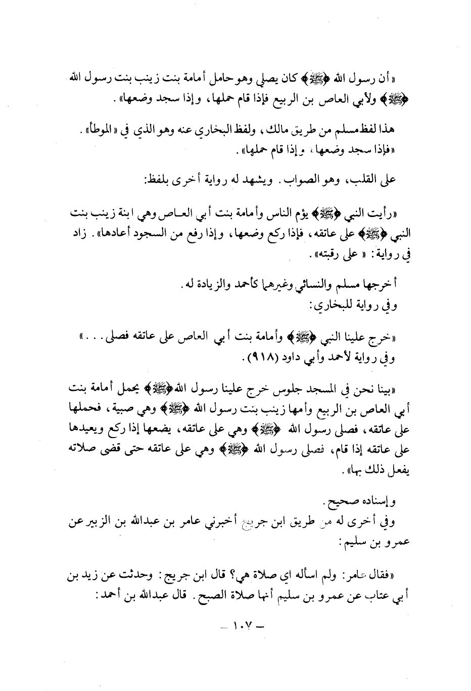 ويشهد له رواية أخرى بلفظ: " رأيت النبى صلى الله عليه وسلم يؤم الناس وأمامة بنت أبى العاص وهى ابنة زينب بنت النبى صلى الله عليه وسلم على عاتقه , فإذا ركع وضعها , وإذا رفع من السجود أعادها ". زاد فى رواية: " على رقبته ".