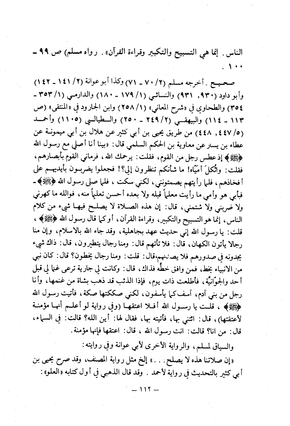 أخرجه مسلم (2/70 ـ 71) وكذا أبو عوانة (2/141 ـ 142) وأبو داود (930 , 931) والنسائى (1/179 ـ 180) والدارمى (1/353 ـ 354) والطحاوى فى " شرح المعانى " (1/258) وابن الجارود فى " المنتقى " (ص 113 ـ 114) والبيهقى (2/49 ـ 52) والطيالسى (1105) وأحمد (5/449 , 448) من طريق يحيى بن أبى كثير عن هلال بن أبى ميمونة عن عطاء بن يسار عن معاوية بن الحكم السلمى قال: " بينما أنا أصلى مع رسول الله صلى الله عليه وسلم إذا عطس رجل من القوم , فقلت: يرحمك الله , فرمانى القوم بأبصارهم , فقلت: واثكل أمياه! ما شأنكم تنظرون إلى؟ ! فجعلوا يضربون بأيديهم على أفخاذهم , فلما رأيتهم يصمتوننى , لكن سكت , فلما صلى رسول الله صلى الله عليه وسلم ـ فبأبى هو وأمى ما رأيت معلماً قبله ولا بعده أحسن تعليماً منه , فوالله ما كهرنى ولا ضربنى ولا شتمنى , قال: إن هذه الصلاة لا يصلح فيها شىء من كلام الناس , إنما هو التسبيح والتكبير , وقراءة القرآن , أو كما قال رسول الله صلى الله عليه وسلم , قلت: يا رسول الله إنى حديث عهد بجاهلية , وقد جاء الله بالإسلام , وإن منا رجالا يأتون الكهان , قال: فلا تأتهم قال: ومنا رجال يتطيرون , قال: ذاك شىء يجدونه فى صدورهم فلا يصدنهم , قال: قلت ومنا رجال يخطون؟ قال: كان نبى من الأنبياء يخط , فمن وافق خطه فذاك , قال: وكانت لى جارية ترعى غنما لى قبل أحد والجوانية , فاطلعت ذات يوم , فإذا الذئب قد ذهب بشاة من غنمها , وأنا رجل من بنى آدم , آسف كما يأسفون , لكنى صككتها صكة , فأتيت رسول الله صلى الله عليه وسلم , قلت يا رسول الله أفلا أعتقها (وفى رواية لو أعلم أنها مؤمنة لأعتقتها) , قال: ائتنى بها , فأتيته بها , فقال لها: أين الله؟ قالت: فى السماء , قال: من أنا؟ قالت: أنت رسول الله , قال: أعتقها فإنها مؤمنة.