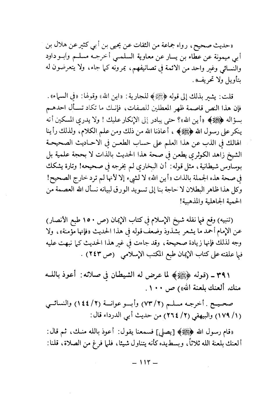 (تنبيه) وقع فيما نقله شيخ الإسلام فى كتاب الإيمان (ص 150 طبع الأنصار) عن الإمام أحمد ما يشعر بشذوذ وضعف قوله فى هذا الحديث (فإنها مؤمنة " , ولا وجه لذلك فإنها زيادة صحيحة , وقد جاءت فى غير هذا الحديث كما نبهت عليه فيما علقته على كتاب الإيمان طبع المكتب الإسلامى (ص 243) .