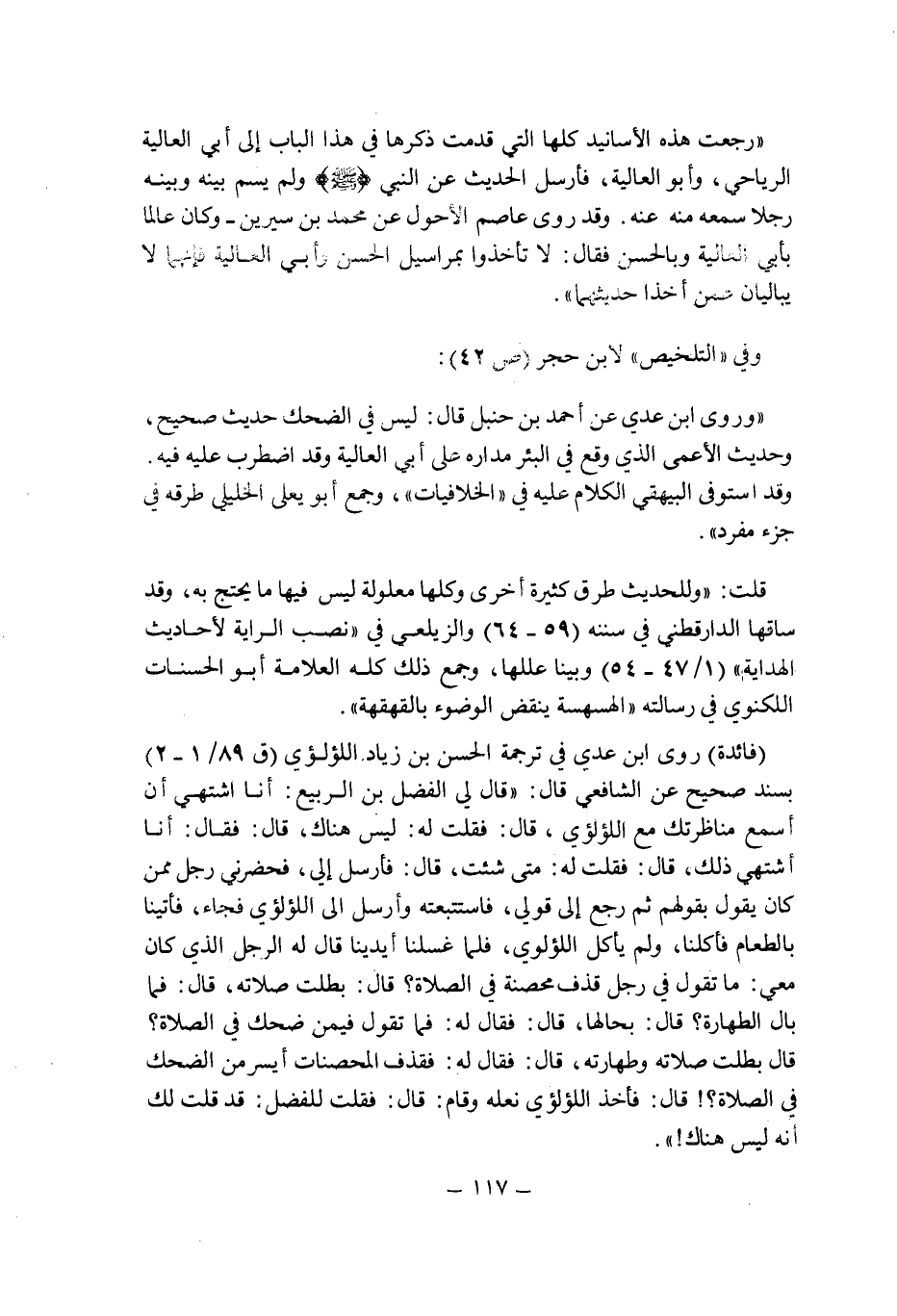 وفى " التلخيص " لابن حجر (ص 42) : " وروى ابن عدى عن أحمد بن حنبل قال: ليس فى الضحك حديث صحيح , وحديث الأعمى الذى وقع فى البئر مداره على أبى العالية وقد اضطرب عليه فيه.