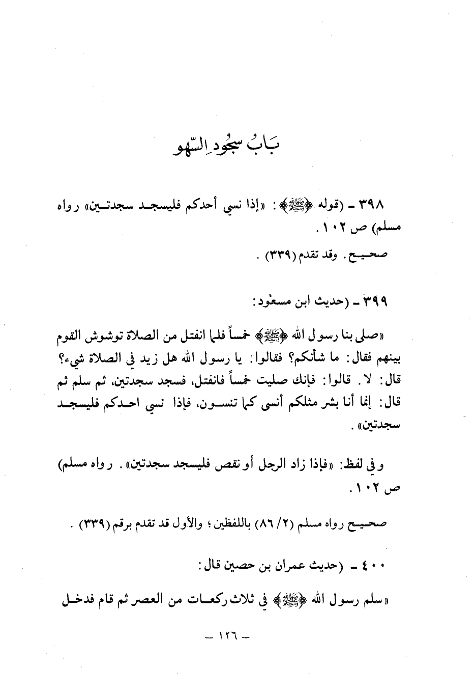 (399) - (حديث ابن مسعود: " صلى بنا رسول الله صلى الله عليه وسلم خمسا فلما انفتل من الصلاة توشوش القوم بينهم فقال: ما شأنكم؟ فقالوا: يا رسول الله هل زيد فى الصلاة شىء؟ قال: لا. قالوا: فإنك صليت خمسا فانفتل , فسجد سجدتين , ثم سلم ثم قال: إنما أنا بشر مثلكم أنسى كما تنسون , فإذا نسى أحدكم فليسجد سجدتين ". وفى لفظ: " فإذا زاد الرجل أو نقص فليسجد سجدتين " رواه مسلم (ص 102) .