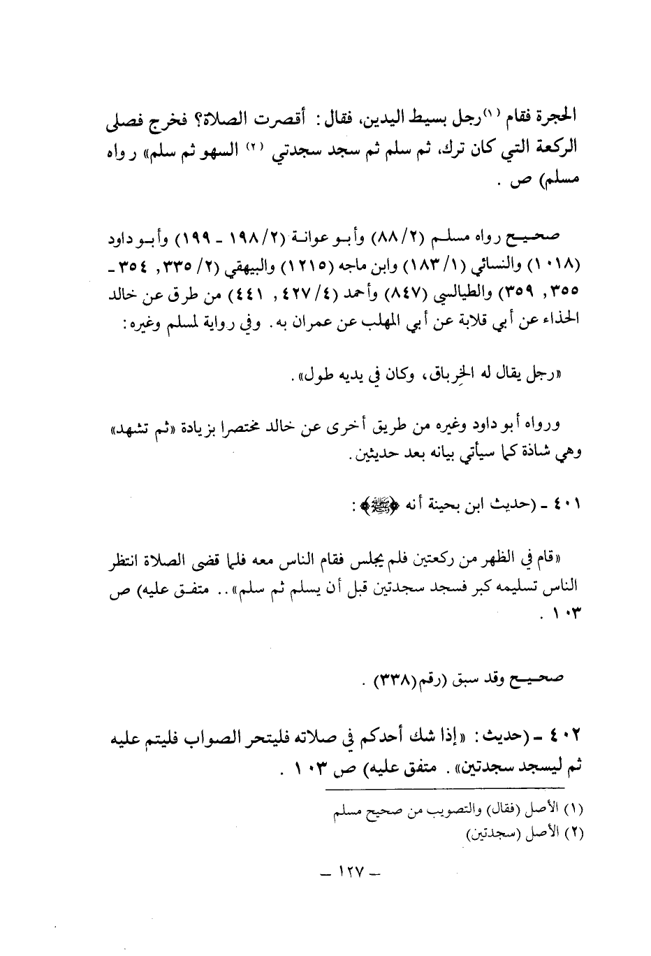 (402) - (حديث: " إذا شك أحدكم فى صلاته فليتحر الصواب فليتم عليه ثم ليسجد سجدتين ". متفق عليه (ص 103) .
